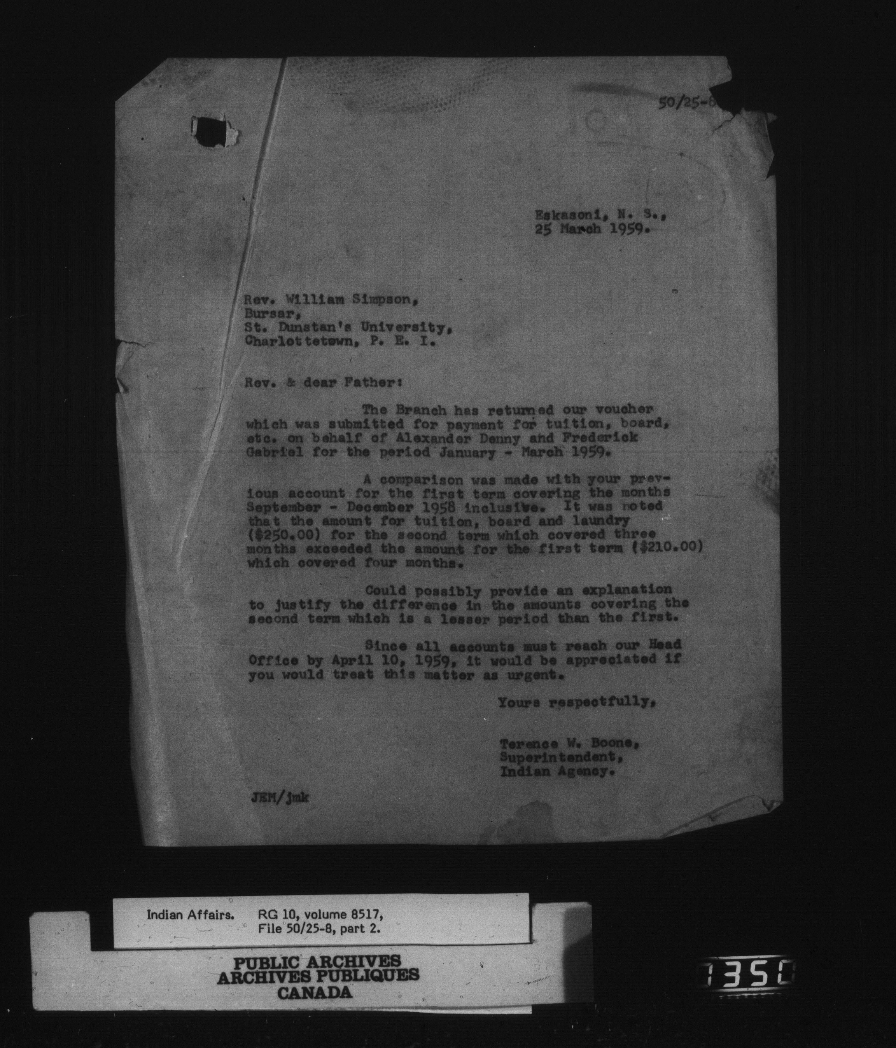 Eskasoni Agency - Admission, Residential School - pt 1 to pt 2