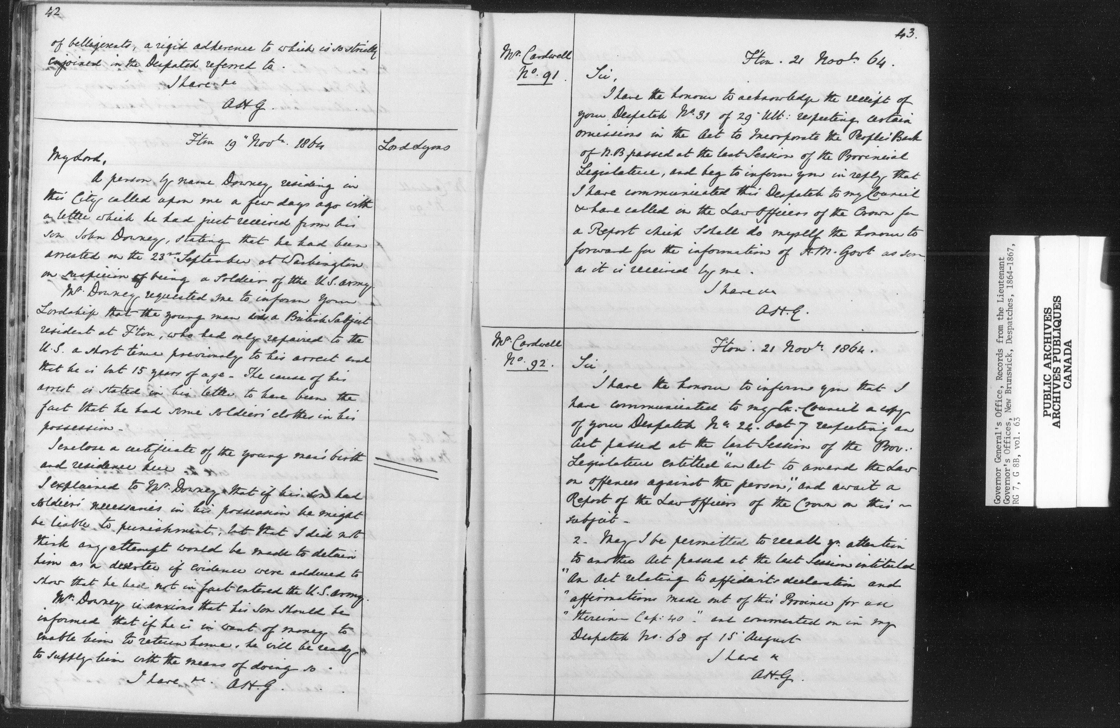 Despatches from Lieutenant Governors to Governor or Lieutenant Governor Nova Scotia, 1820-1827 and 1836-1877 ; Registers of correspondence ; Schedule of despatches exchanged ; Miscellaneous memoranda and despatches ; Schedule of despatches received - C-15631