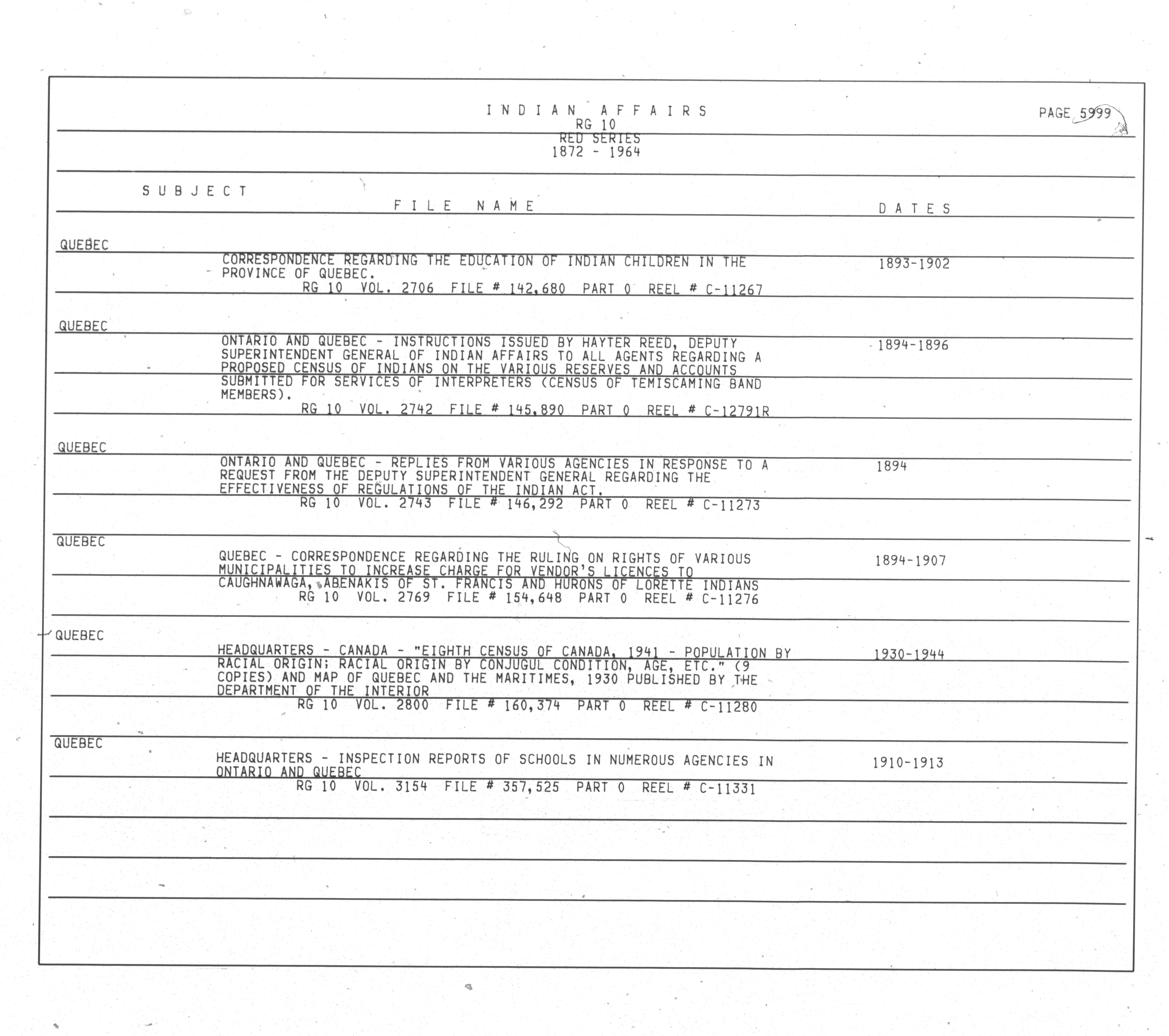 Subject list to the Red Series documents of the Department of Indian Affairs, 1872-1964 - 15716
