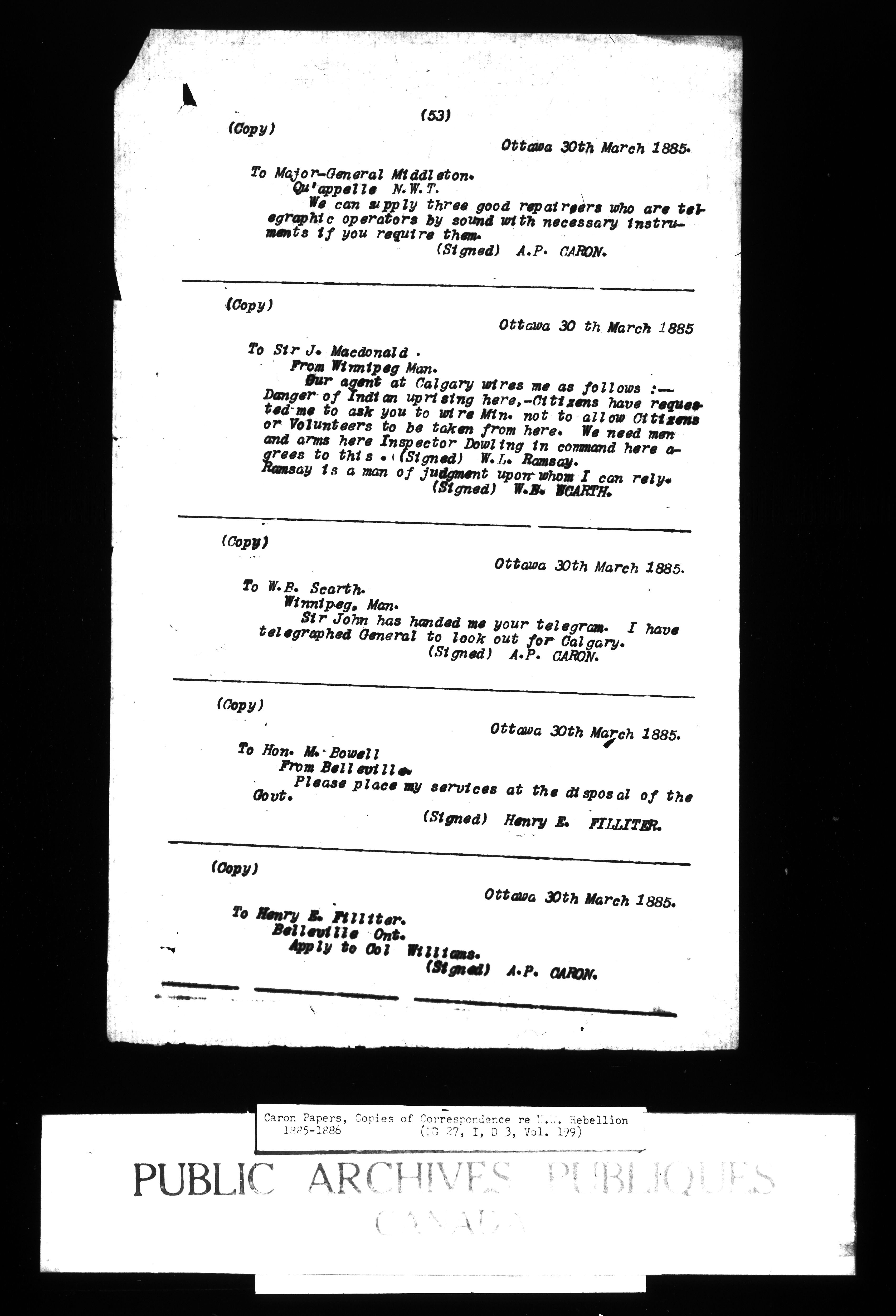 Caron Papers - Correspondence arranged in chronological order concerning the Northwest Rebellion, May 1885-Feb 1886 - 1654