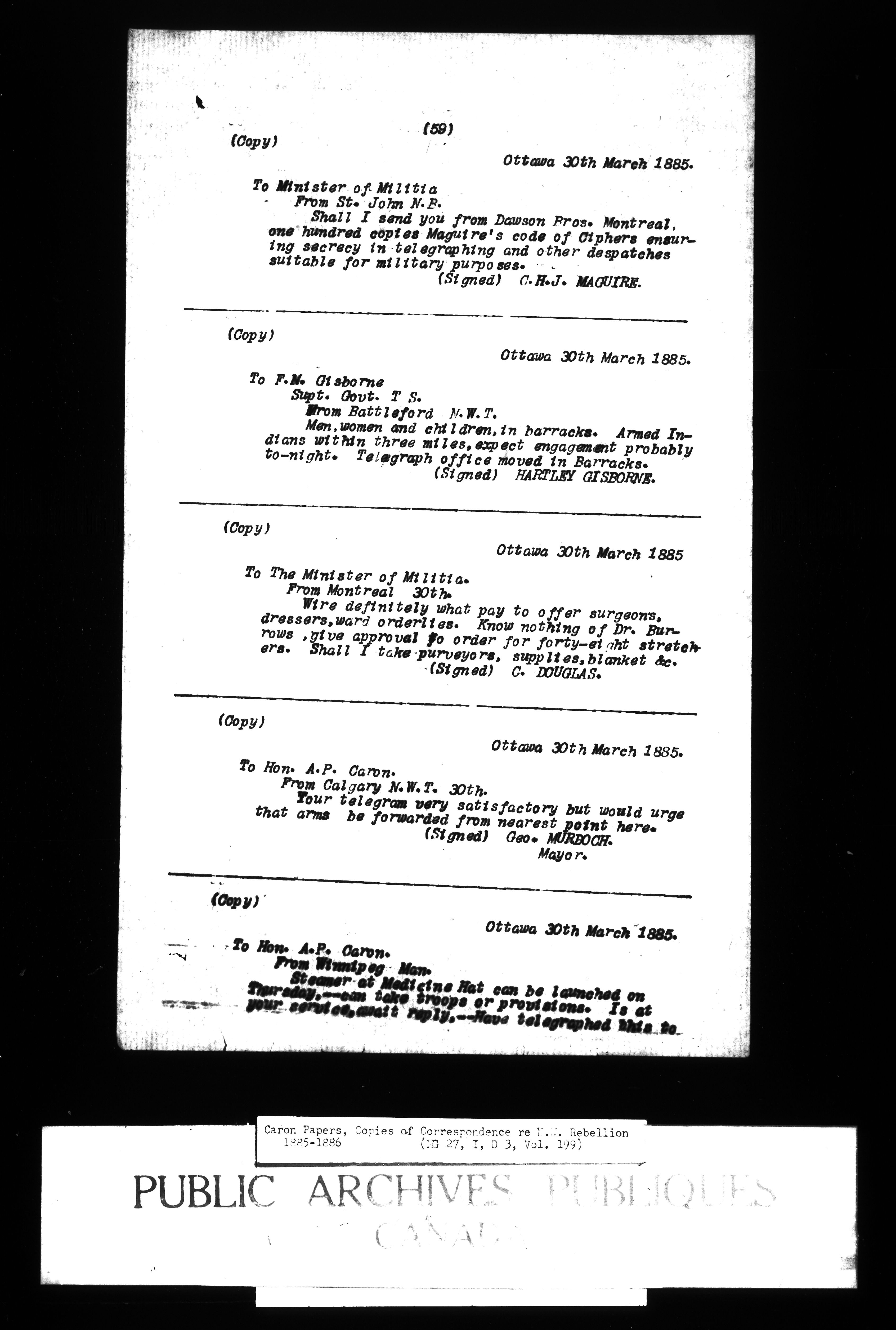 Caron Papers - Correspondence arranged in chronological order concerning the Northwest Rebellion, May 1885-Feb 1886 - 1654