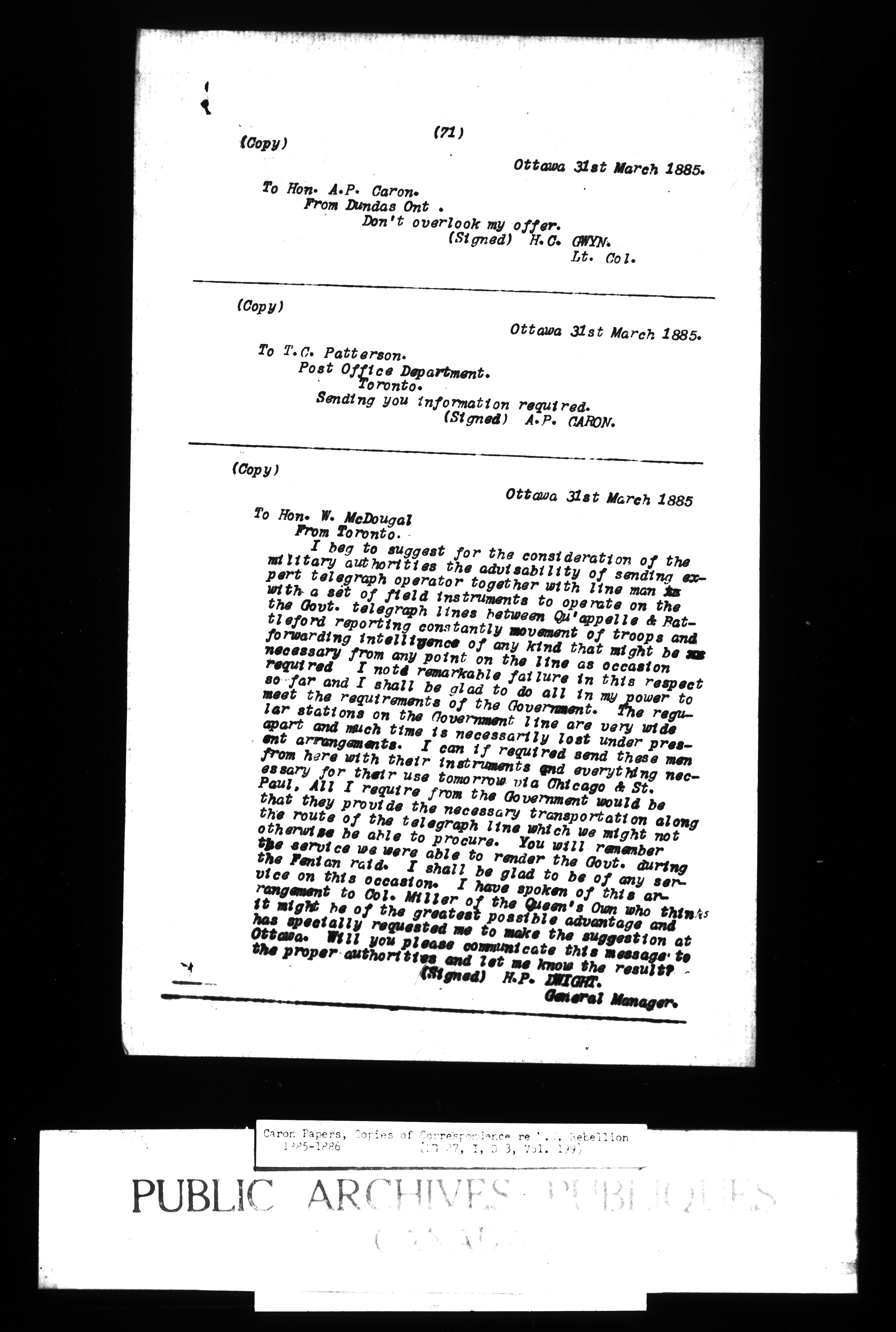 Caron Papers - Correspondence arranged in chronological order concerning the Northwest Rebellion, May 1885-Feb 1886 - 1654