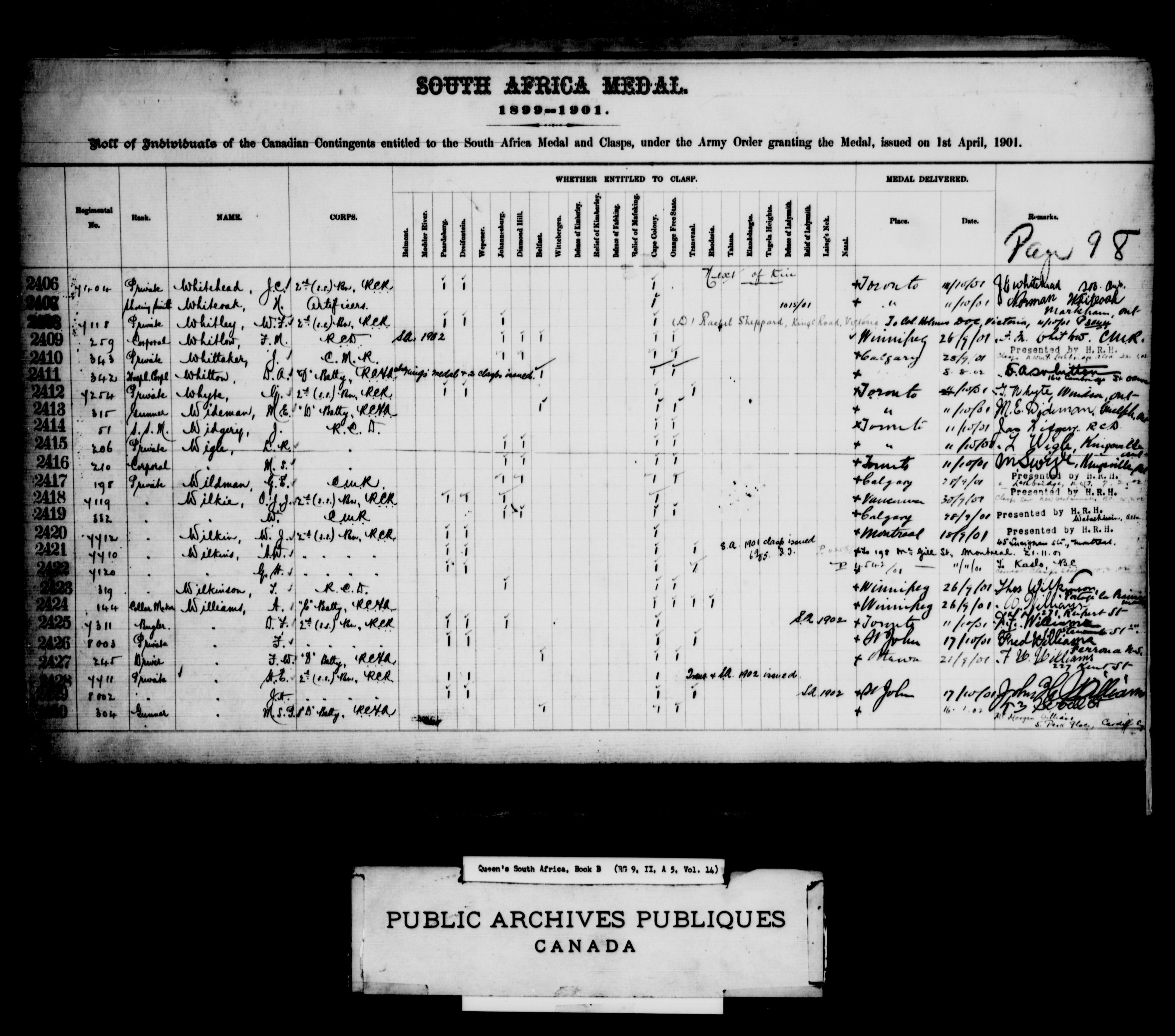 Queen's South Africa Medal Register, Book B : 2nd S.S. Battalion, R.C.R., R.C.F.A, R.C.D, C.M.R., Artificers, Canadian Postal Corps, Y.M.C.A., Lord Strathcona's Horse, C.A.M.C., French's Scouts, vol. 14