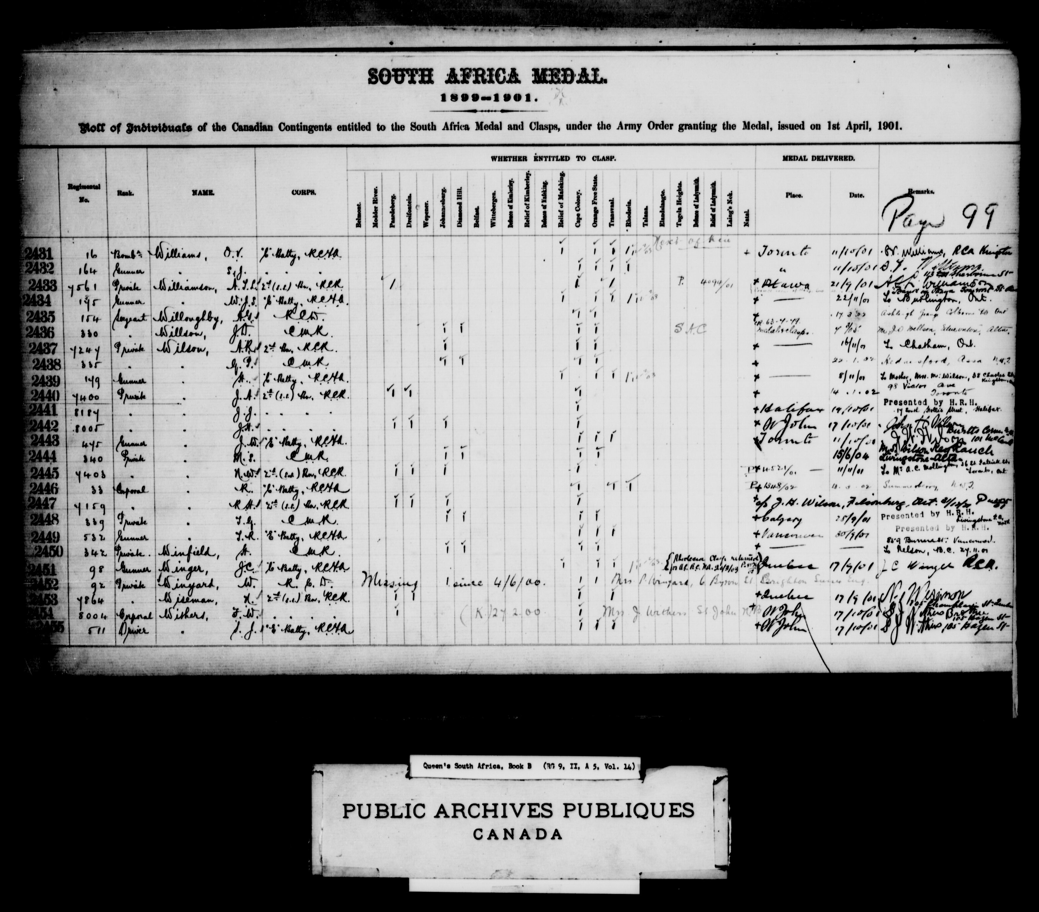Queen's South Africa Medal Register, Book B : 2nd S.S. Battalion, R.C.R., R.C.F.A, R.C.D, C.M.R., Artificers, Canadian Postal Corps, Y.M.C.A., Lord Strathcona's Horse, C.A.M.C., French's Scouts, vol. 14