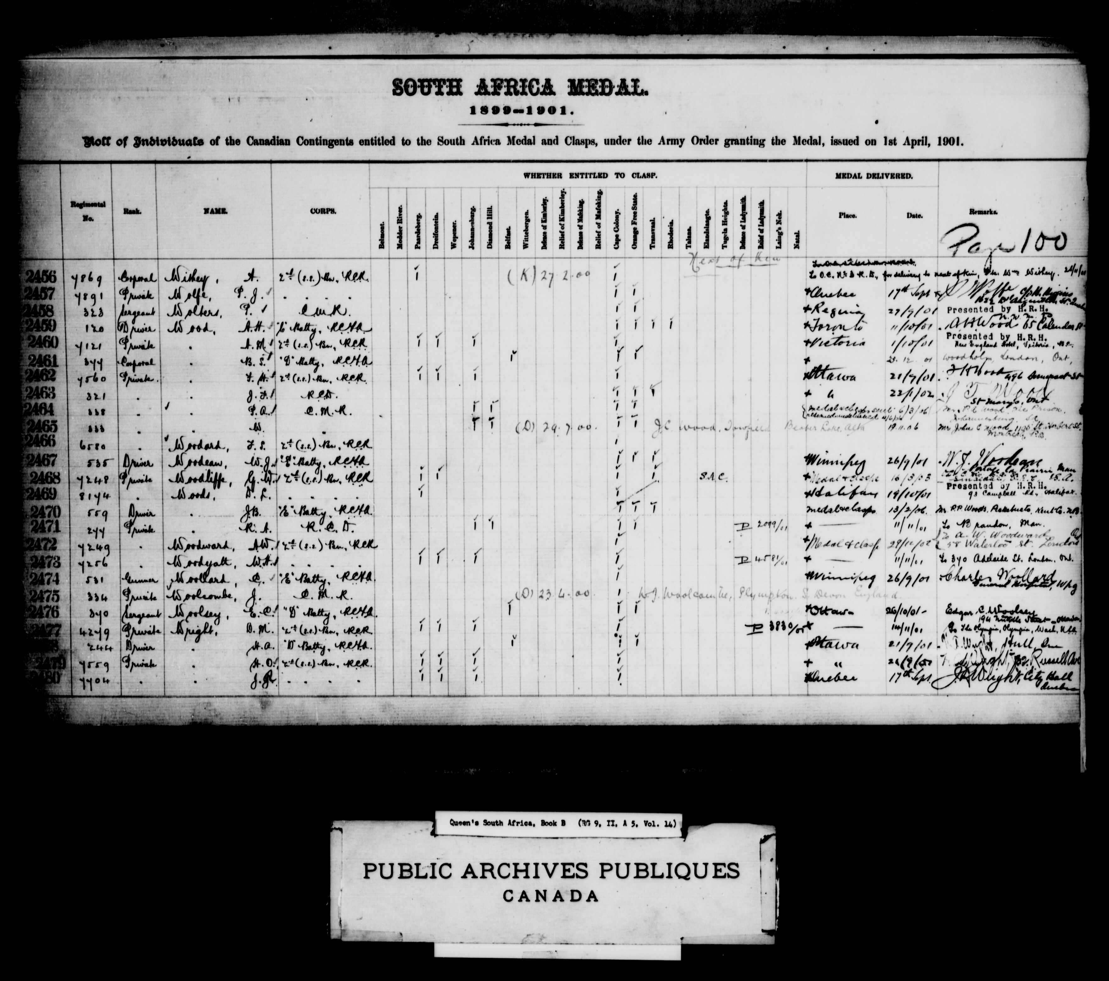 Queen's South Africa Medal Register, Book B : 2nd S.S. Battalion, R.C.R., R.C.F.A, R.C.D, C.M.R., Artificers, Canadian Postal Corps, Y.M.C.A., Lord Strathcona's Horse, C.A.M.C., French's Scouts, vol. 14
