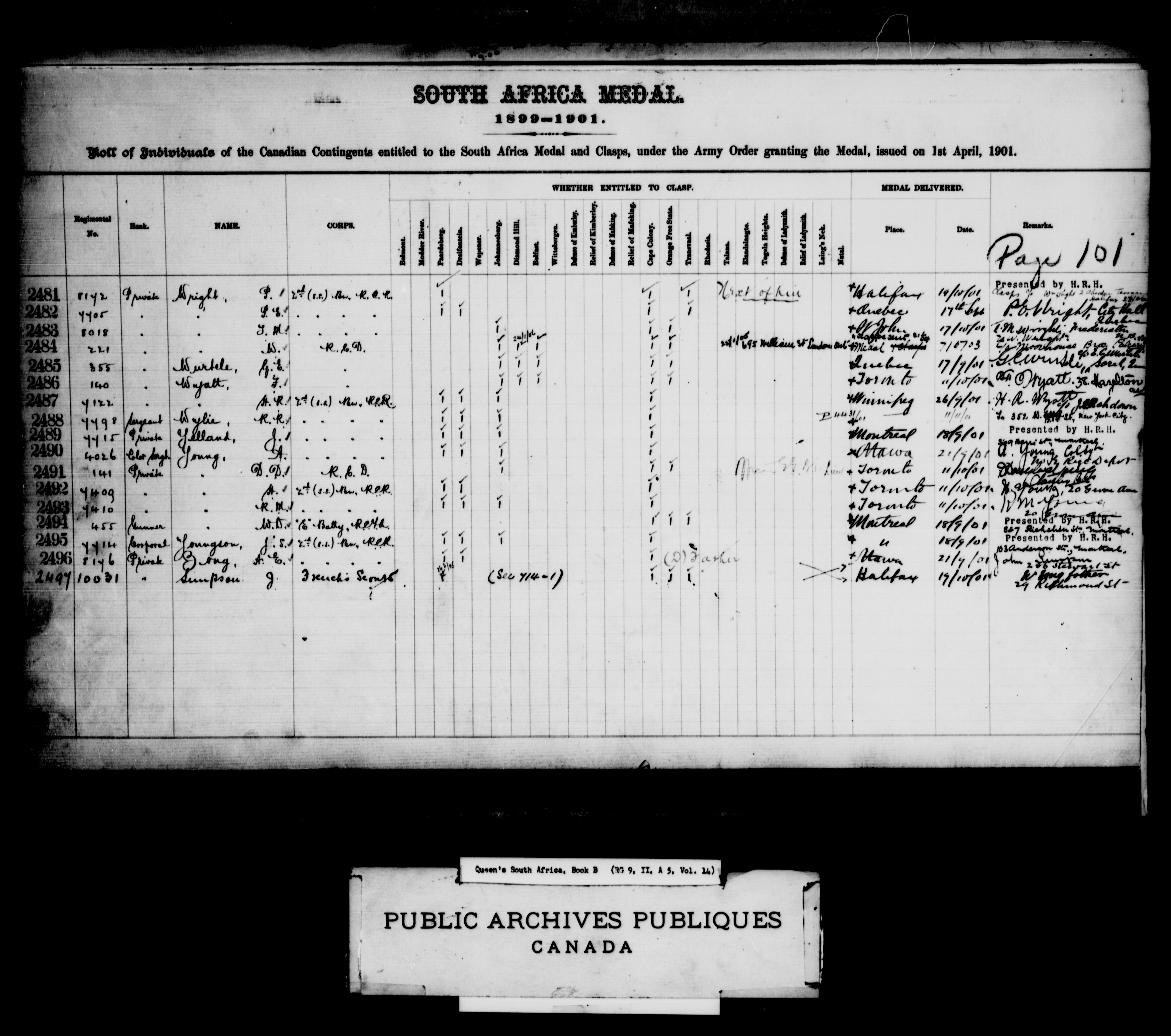 Queen's South Africa Medal Register, Book B : 2nd S.S. Battalion, R.C.R., R.C.F.A, R.C.D, C.M.R., Artificers, Canadian Postal Corps, Y.M.C.A., Lord Strathcona's Horse, C.A.M.C., French's Scouts, vol. 14