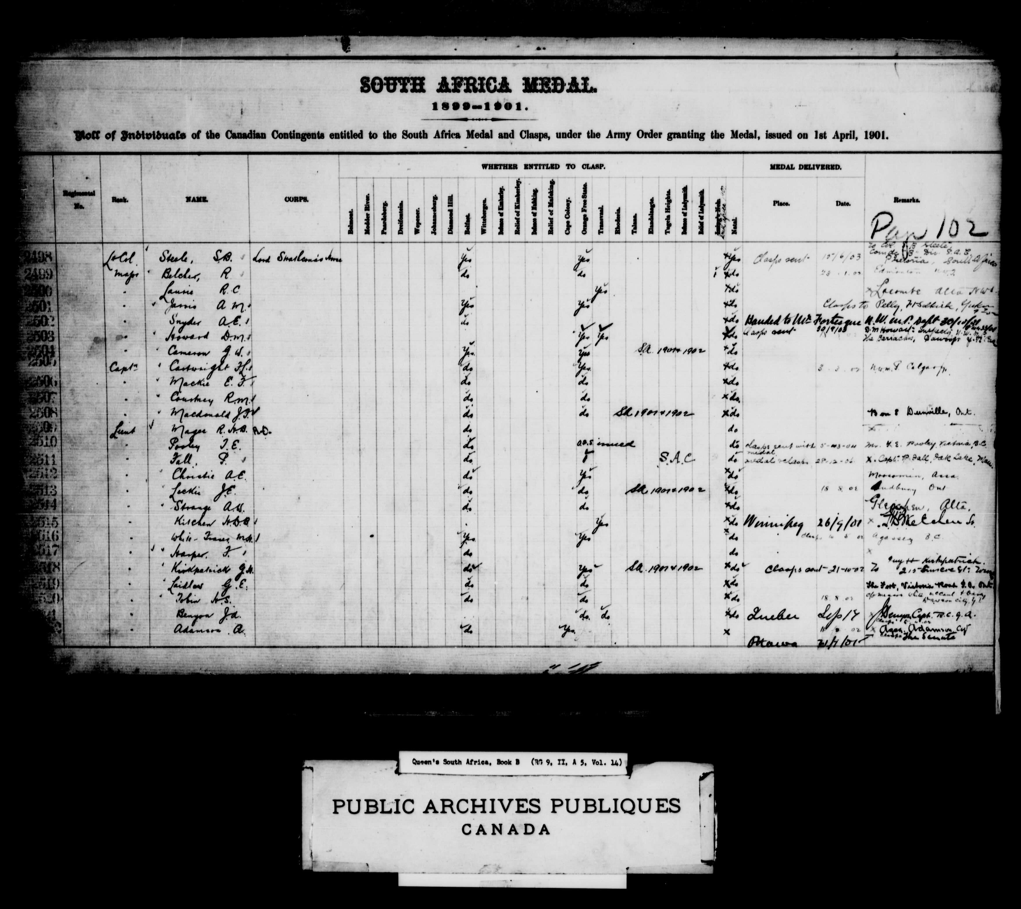 Queen's South Africa Medal Register, Book B : 2nd S.S. Battalion, R.C.R., R.C.F.A, R.C.D, C.M.R., Artificers, Canadian Postal Corps, Y.M.C.A., Lord Strathcona's Horse, C.A.M.C., French's Scouts, vol. 14