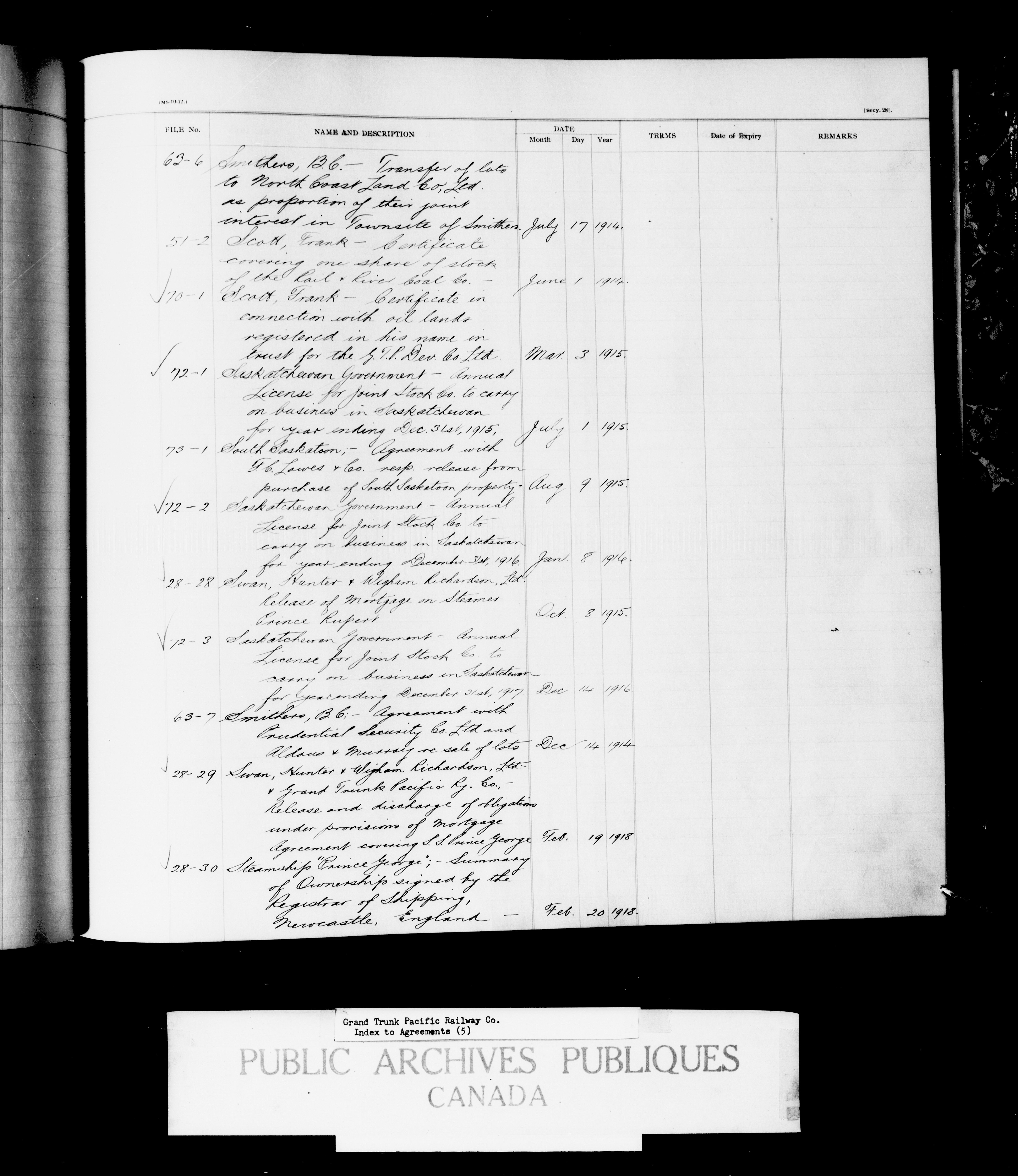 Grand Trunk Pacific Railway Company : Index to Agreements - 2094