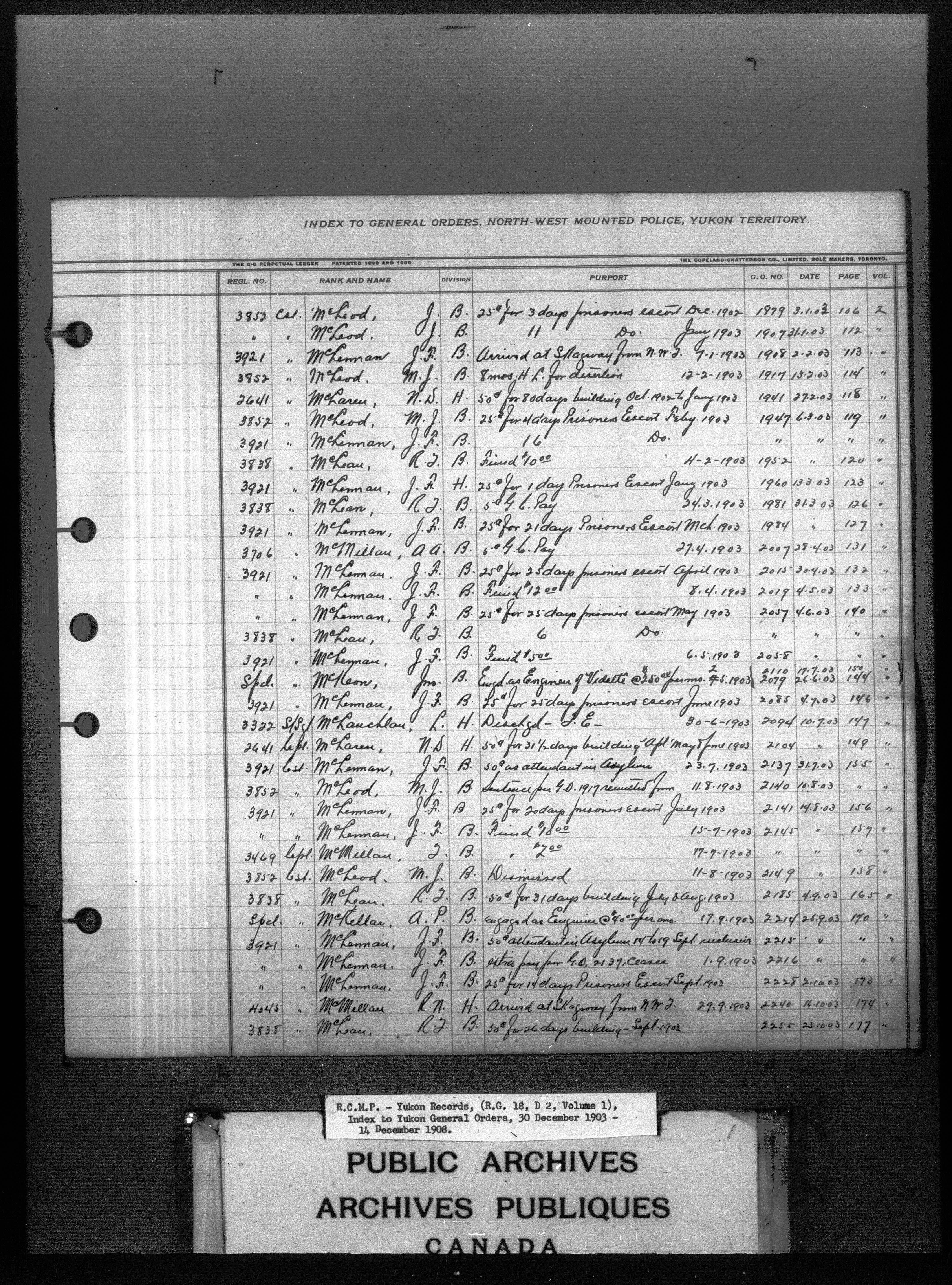 Index to general orders of the North-West Mounted Police, Yukon terrritory - 2150