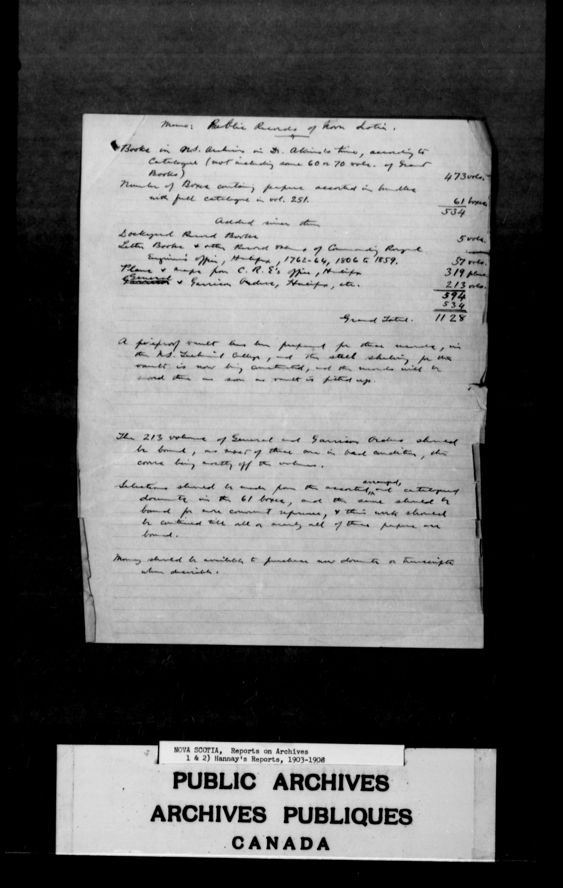 Image 00005 - Hannay's Reports (1 & 2), 1903-1908; image 00449 - Hannay's Report on Parish Registers, 1908; image 00483 - Nova Scotia Church Records 4) Inscriptions on tombstones in burial grounds, 1709-1917; image 00676 - Church Records 11) Digby, 1786-1845, Trinity, Anglican, parish register