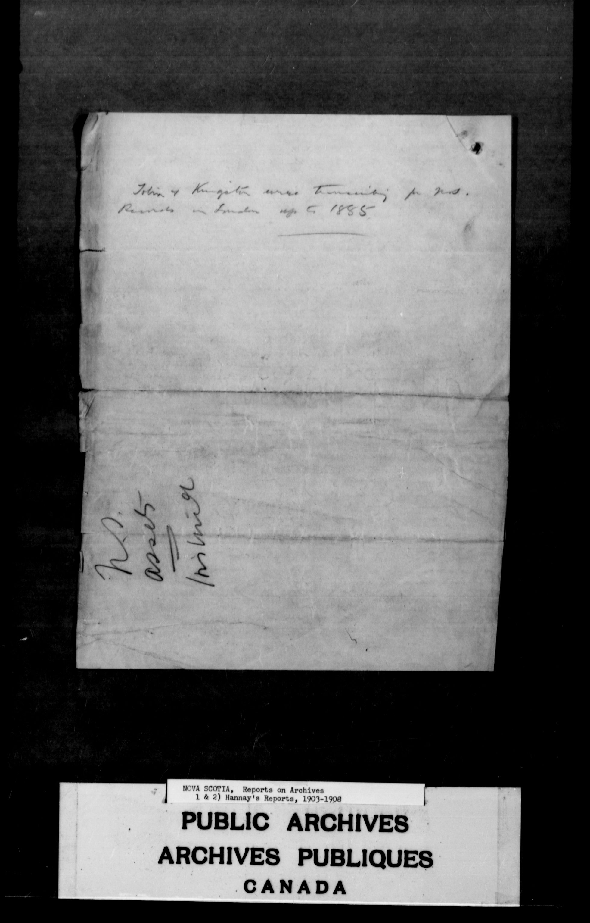 Image 00005 - Hannay's Reports (1 & 2), 1903-1908; image 00449 - Hannay's Report on Parish Registers, 1908; image 00483 - Nova Scotia Church Records 4) Inscriptions on tombstones in burial grounds, 1709-1917; image 00676 - Church Records 11) Digby, 1786-1845, Trinity, Anglican, parish register