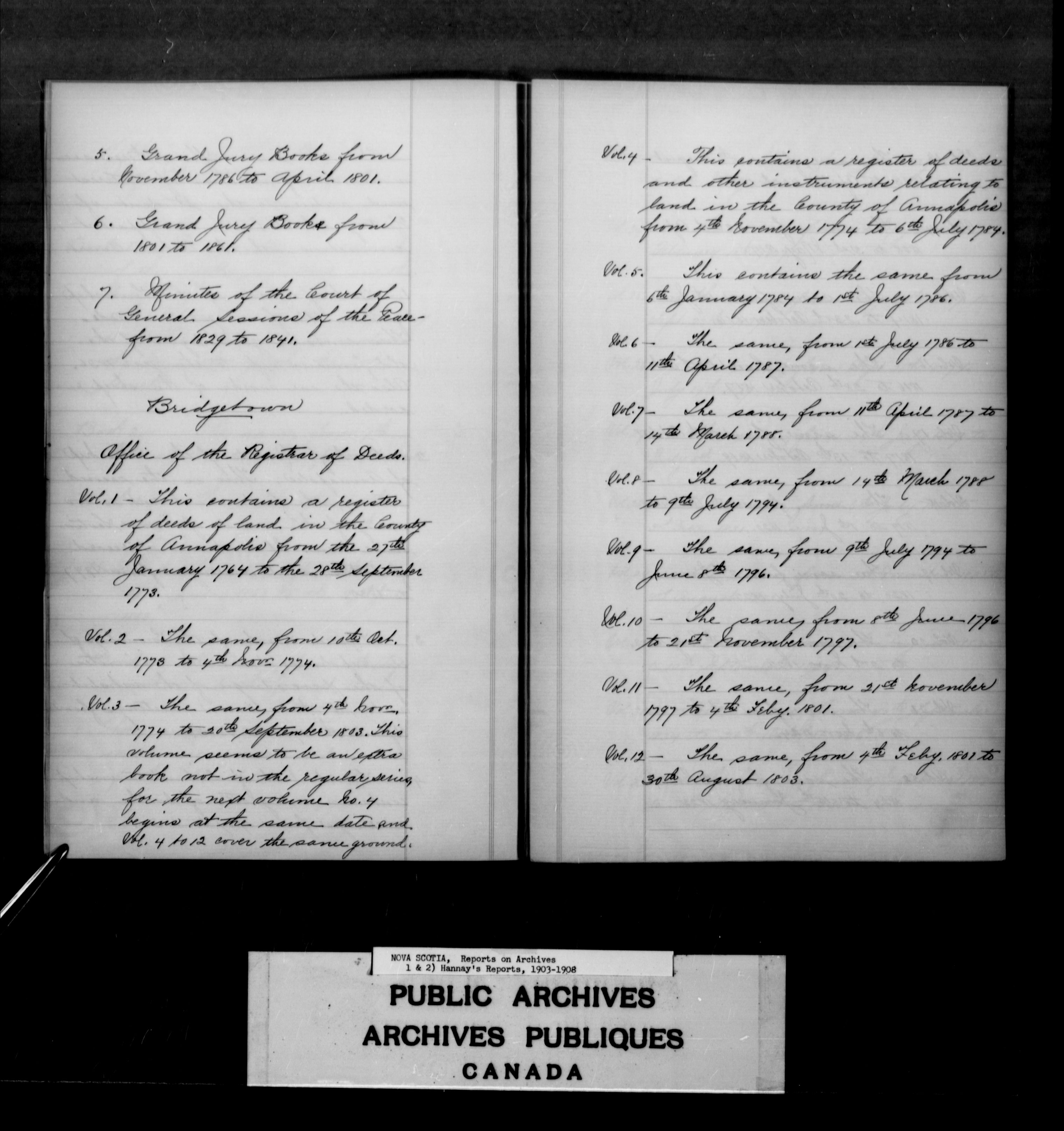 Image 00005 - Hannay's Reports (1 & 2), 1903-1908; image 00449 - Hannay's Report on Parish Registers, 1908; image 00483 - Nova Scotia Church Records 4) Inscriptions on tombstones in burial grounds, 1709-1917; image 00676 - Church Records 11) Digby, 1786-1845, Trinity, Anglican, parish register