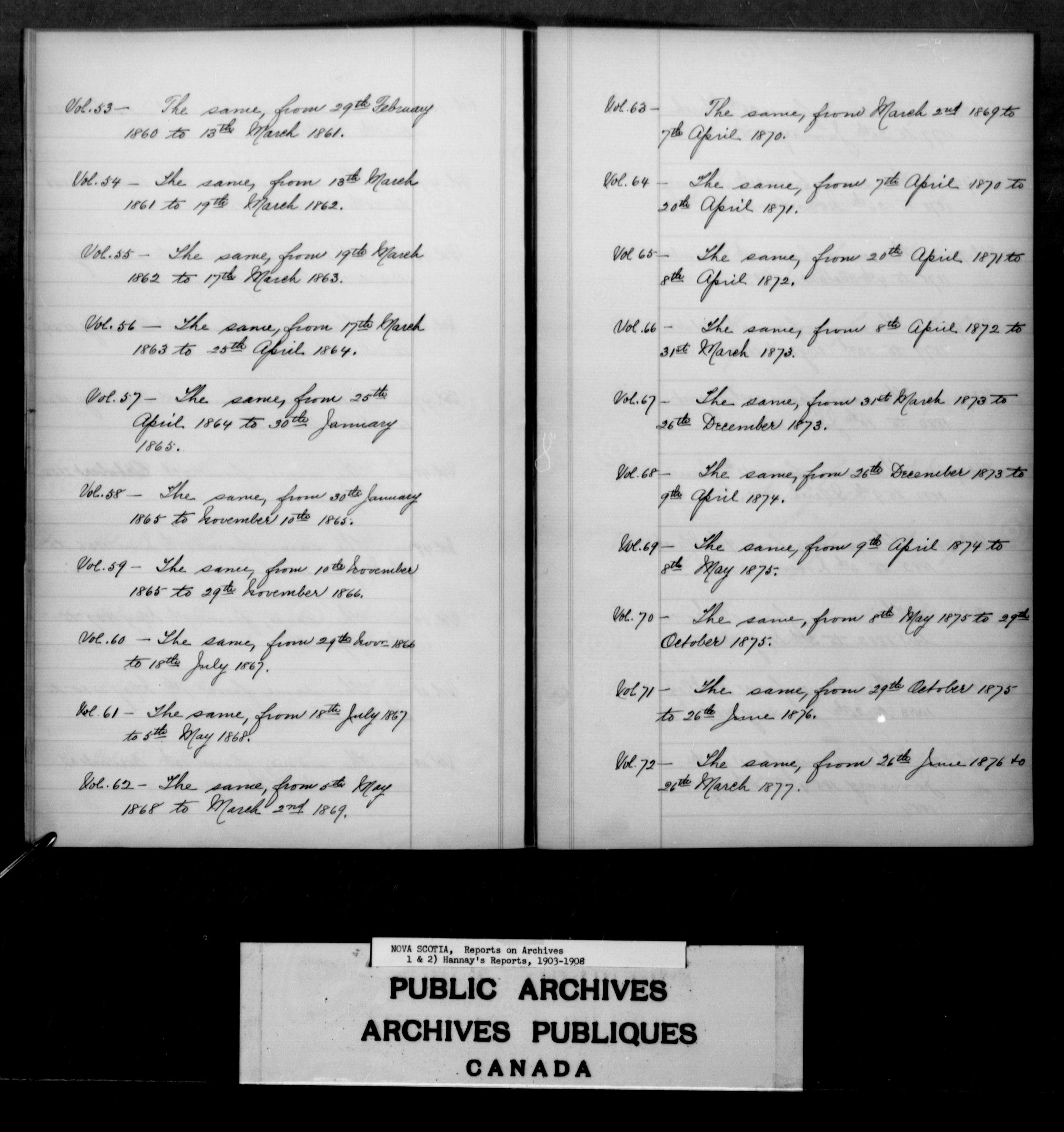 Image 00005 - Hannay's Reports (1 & 2), 1903-1908; image 00449 - Hannay's Report on Parish Registers, 1908; image 00483 - Nova Scotia Church Records 4) Inscriptions on tombstones in burial grounds, 1709-1917; image 00676 - Church Records 11) Digby, 1786-1845, Trinity, Anglican, parish register