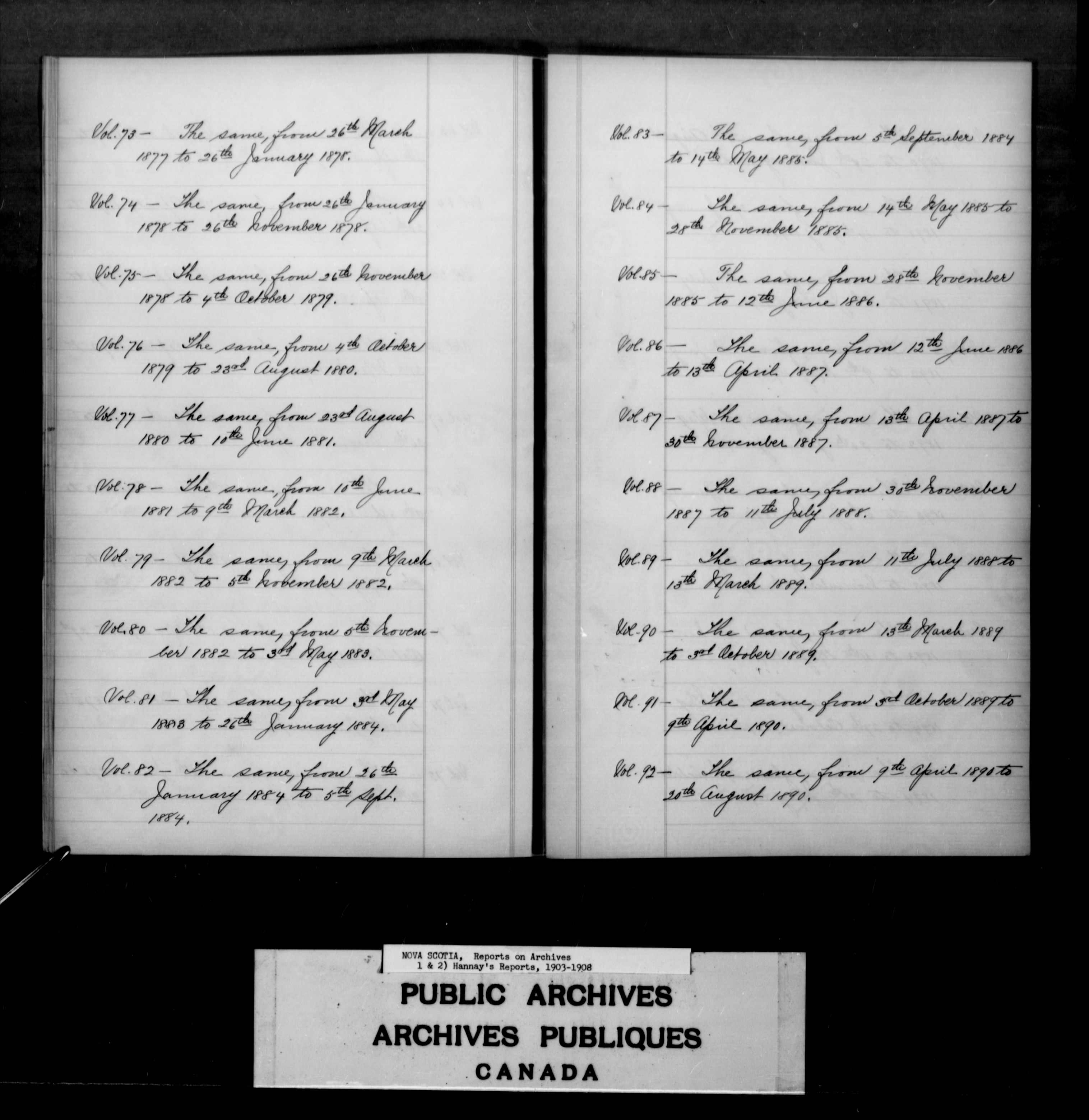 Image 00005 - Hannay's Reports (1 & 2), 1903-1908; image 00449 - Hannay's Report on Parish Registers, 1908; image 00483 - Nova Scotia Church Records 4) Inscriptions on tombstones in burial grounds, 1709-1917; image 00676 - Church Records 11) Digby, 1786-1845, Trinity, Anglican, parish register