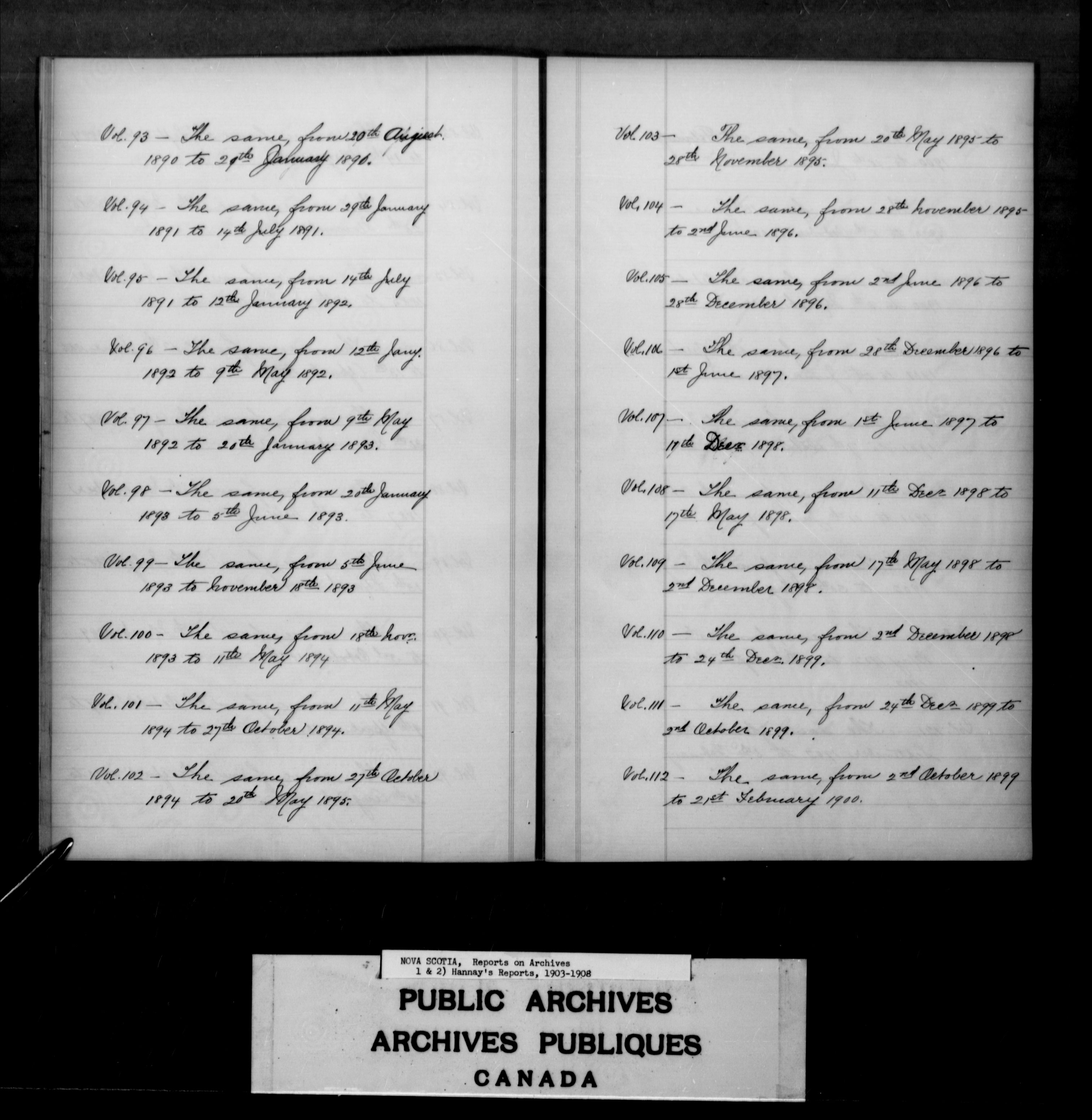 Image 00005 - Hannay's Reports (1 & 2), 1903-1908; image 00449 - Hannay's Report on Parish Registers, 1908; image 00483 - Nova Scotia Church Records 4) Inscriptions on tombstones in burial grounds, 1709-1917; image 00676 - Church Records 11) Digby, 1786-1845, Trinity, Anglican, parish register