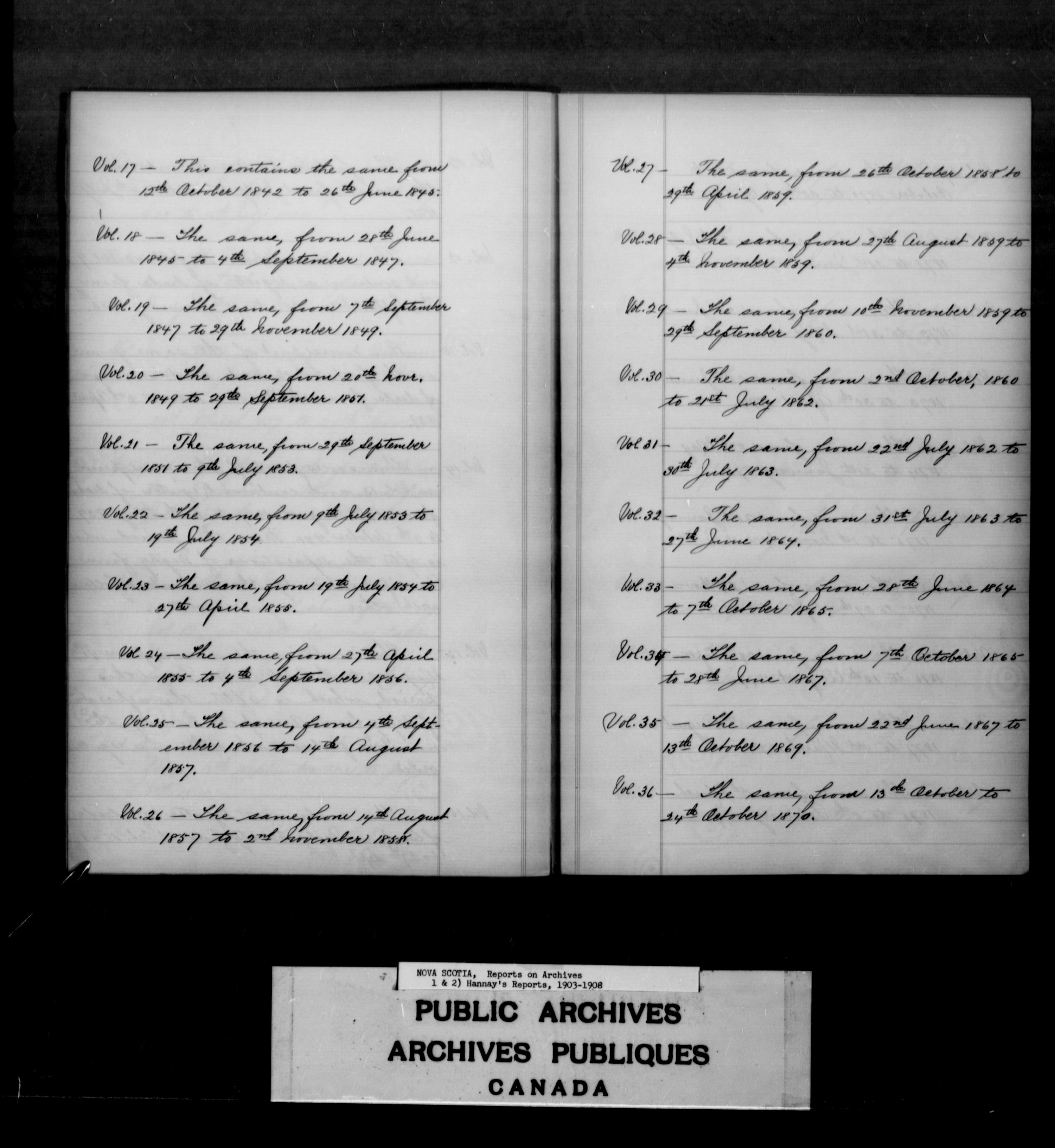 Image 00005 - Hannay's Reports (1 & 2), 1903-1908; image 00449 - Hannay's Report on Parish Registers, 1908; image 00483 - Nova Scotia Church Records 4) Inscriptions on tombstones in burial grounds, 1709-1917; image 00676 - Church Records 11) Digby, 1786-1845, Trinity, Anglican, parish register