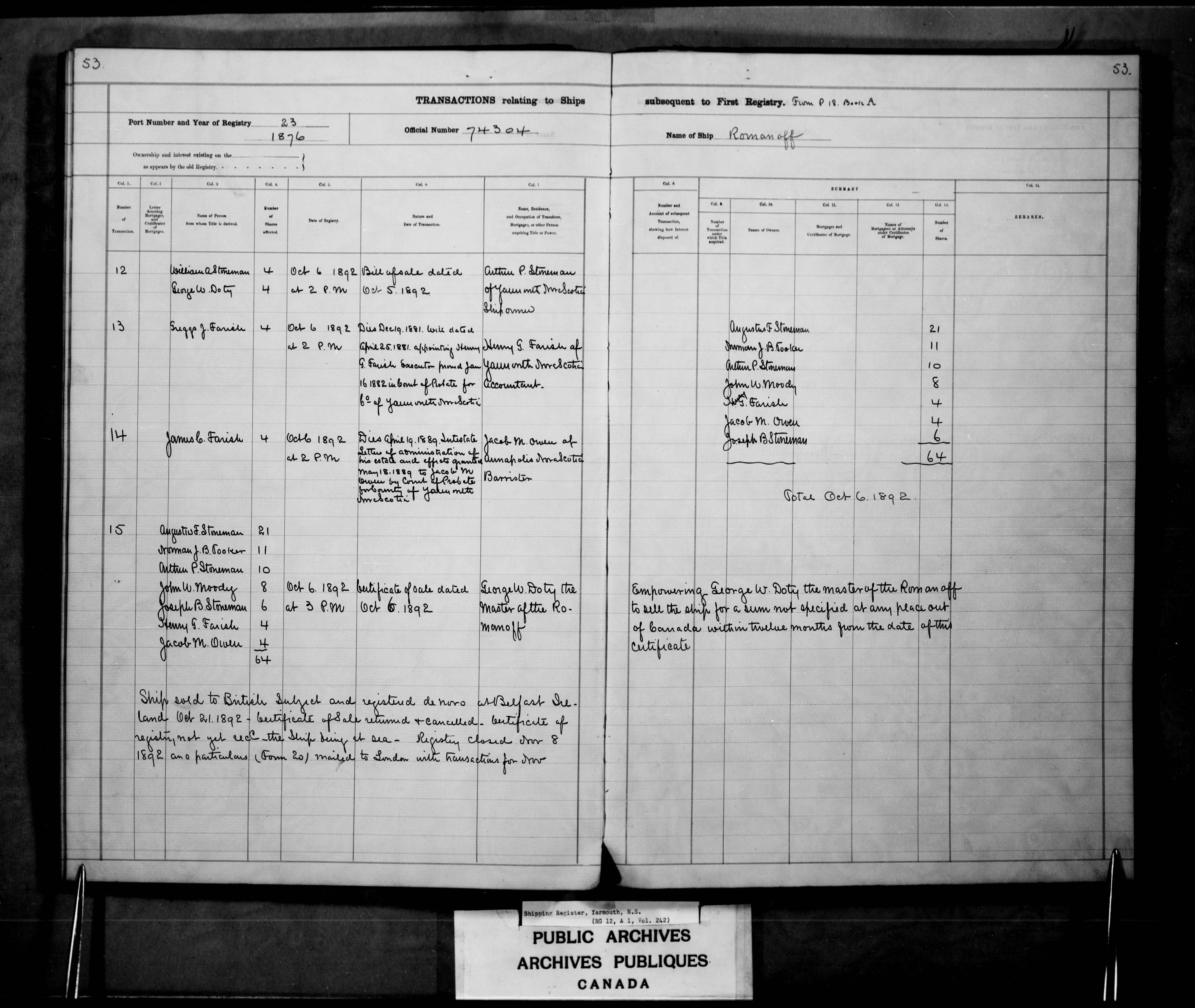 Yarmouth [Nova Scotia] Registrar of Shipping - 2450
