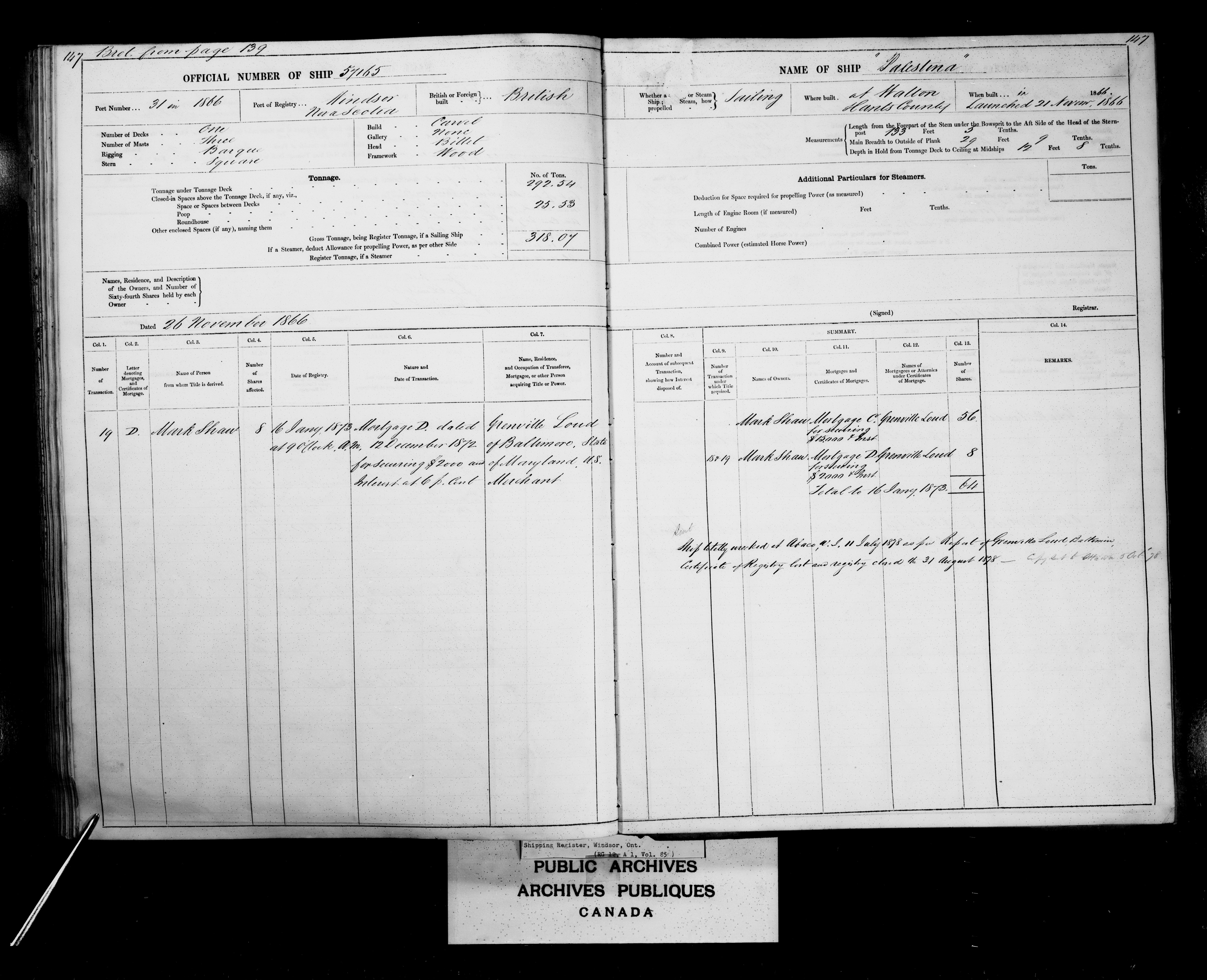 Windsor, Nova Scotia Registrar of Shipping - 2456