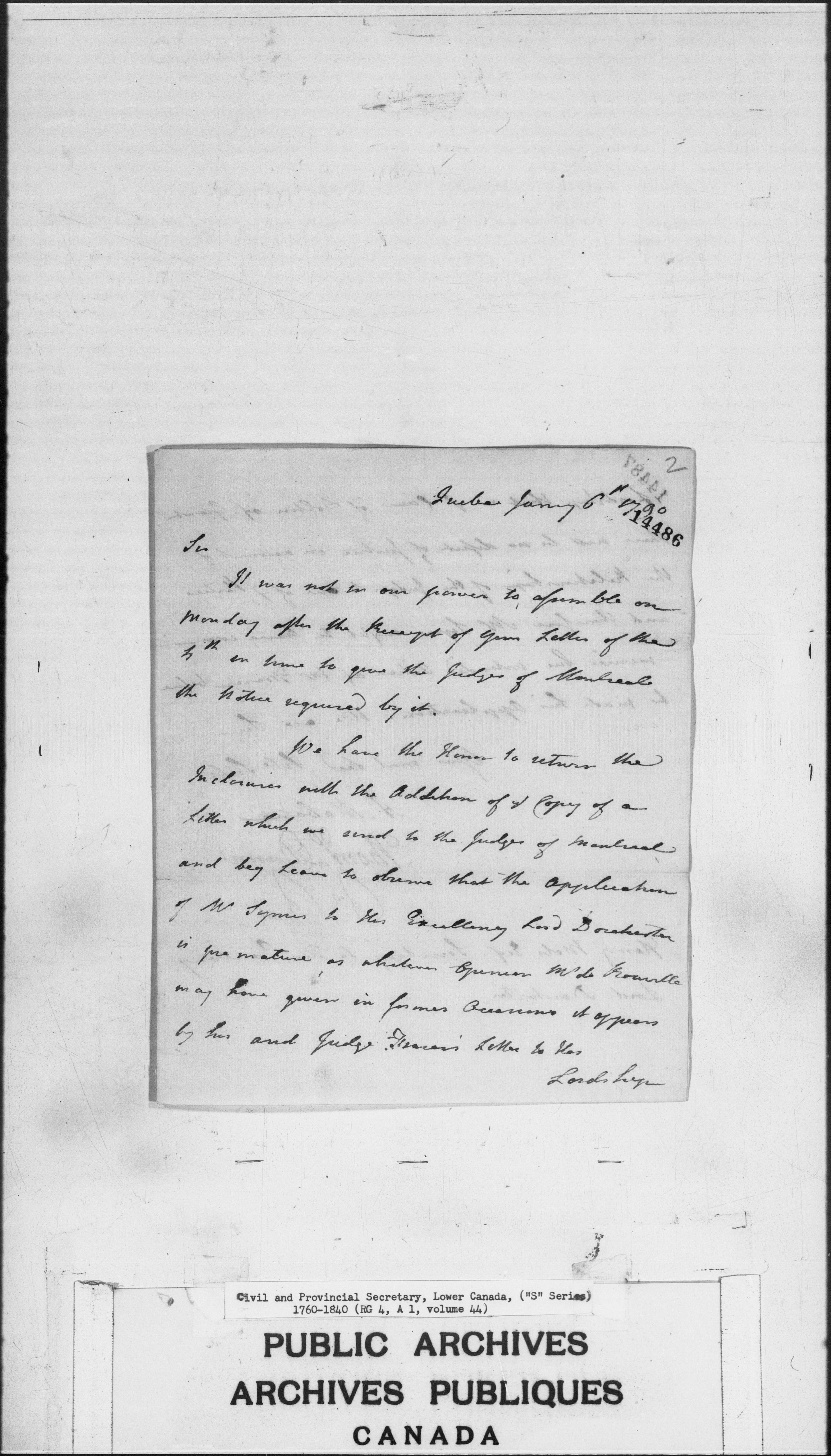 Civil Secretary's correspondence : A 1 - S Series : Quebec and Lower Canada : C-3005