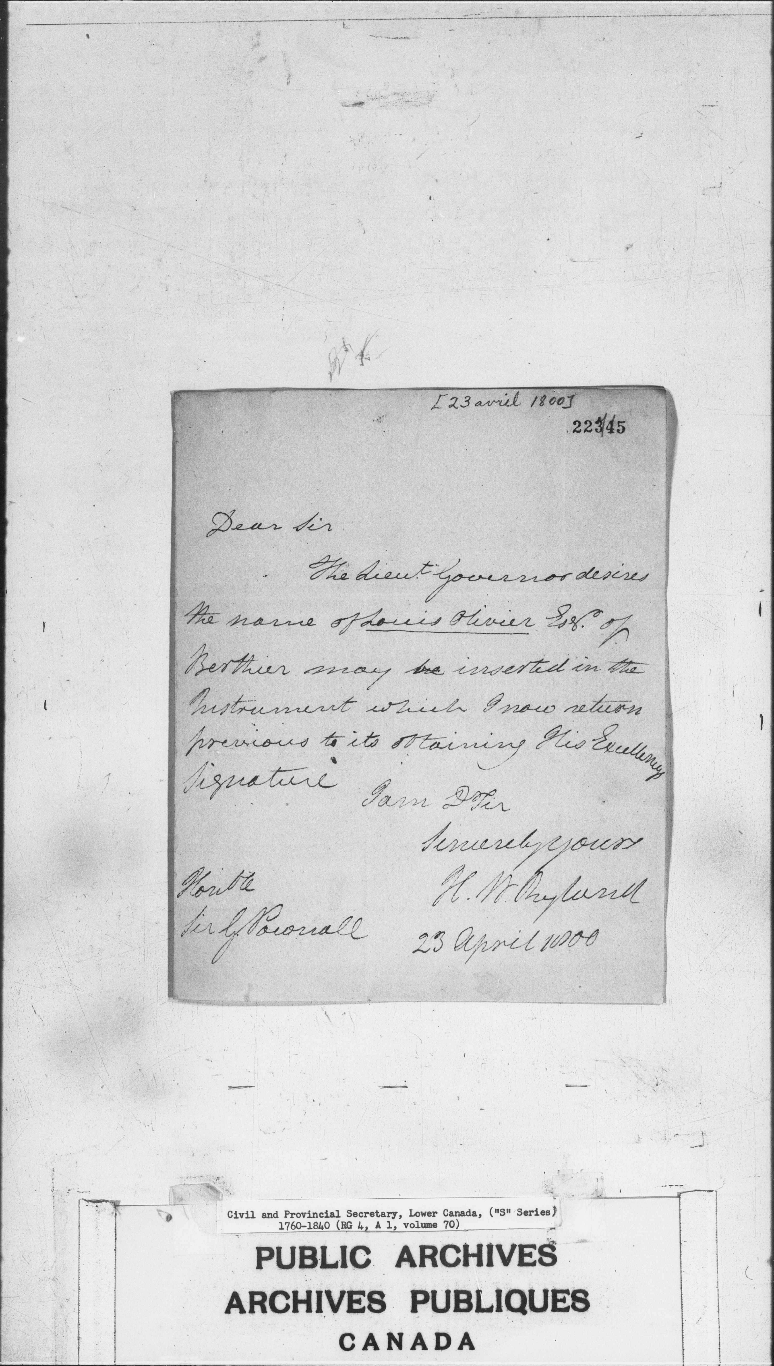 Civil Secretary's correspondence : A 1 - S Series : Quebec and Lower Canada : C-3012