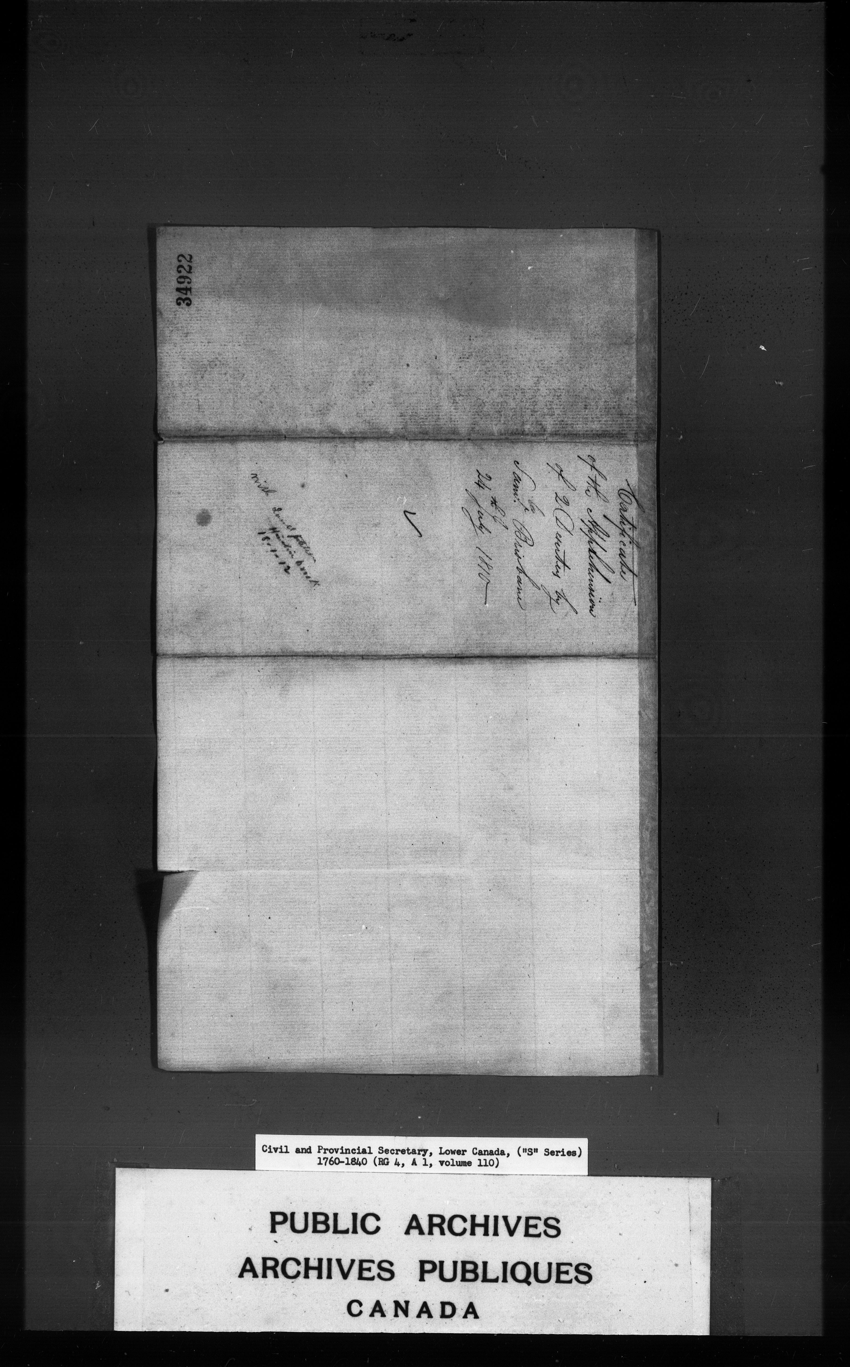 Civil Secretary's correspondence : A1 -S Series, Quebec and Lower Canada, 1760-1840 - 3196