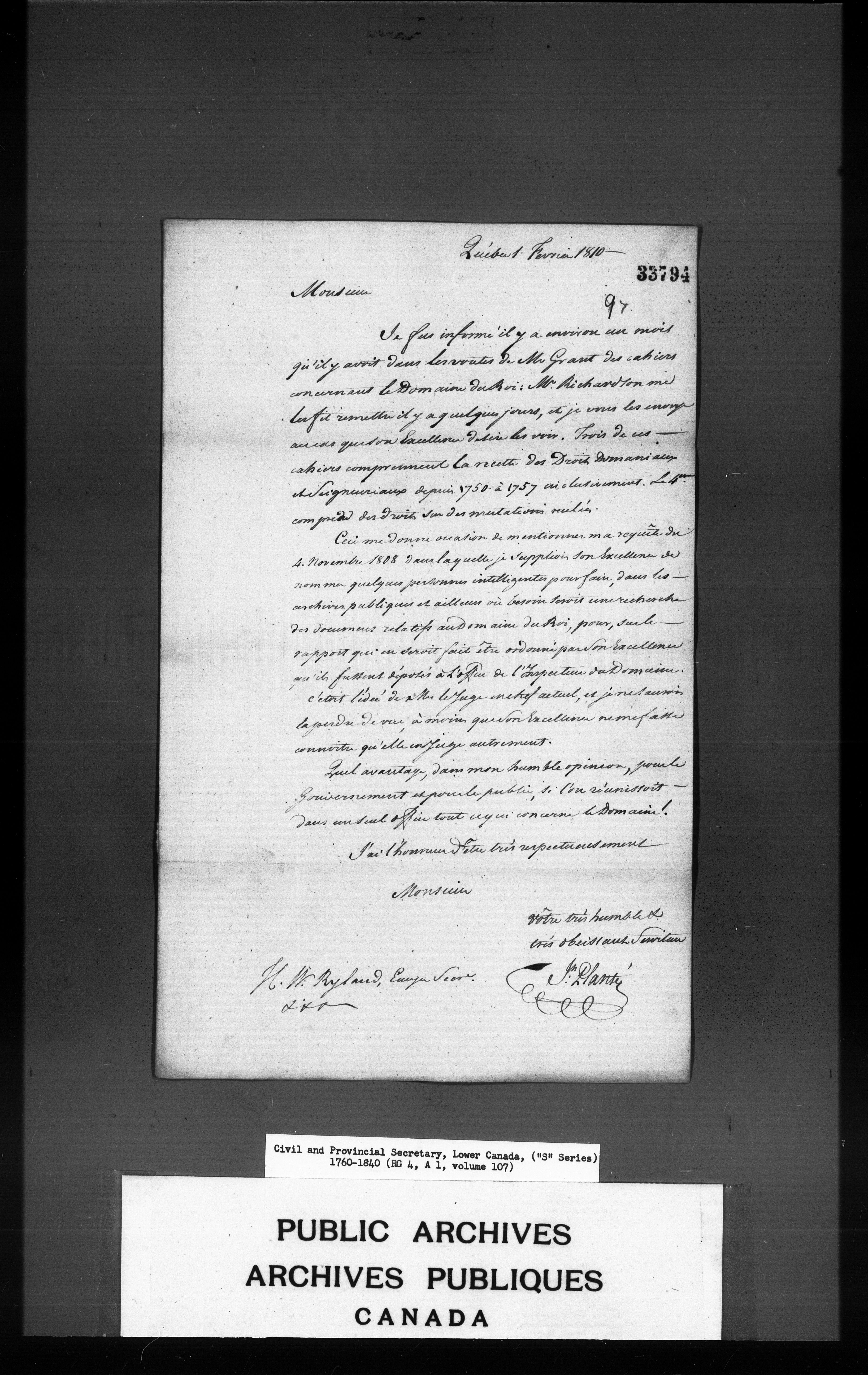 Civil Secretary's correspondence : A1 -S Series, Quebec and Lower Canada, 1760-1840 - 3196