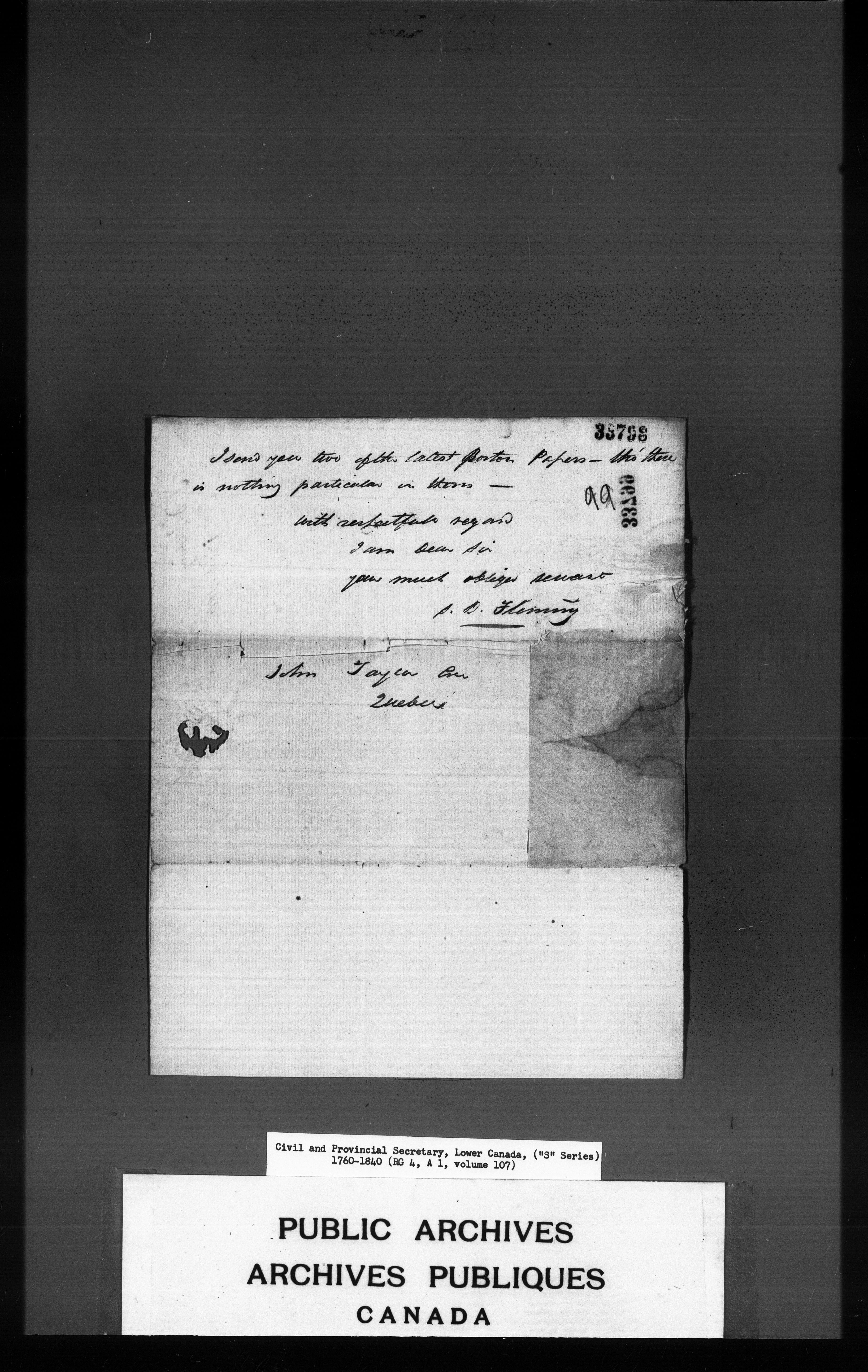 Civil Secretary's correspondence : A 1 - S Series : Quebec and Lower Canada : C-3196
