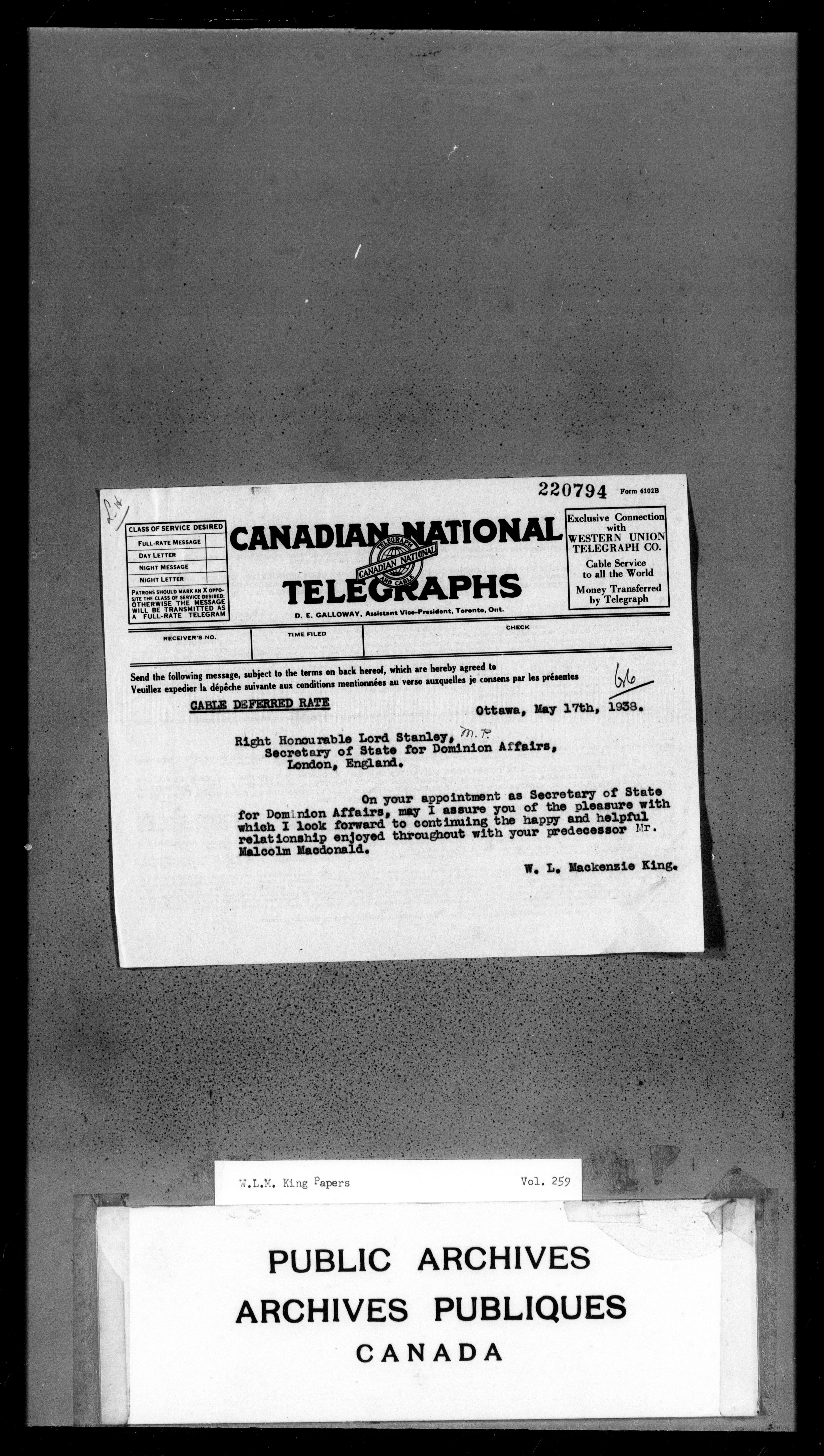 William Lyon Mackenzie King : Primary series correspondence (J1) - 3739