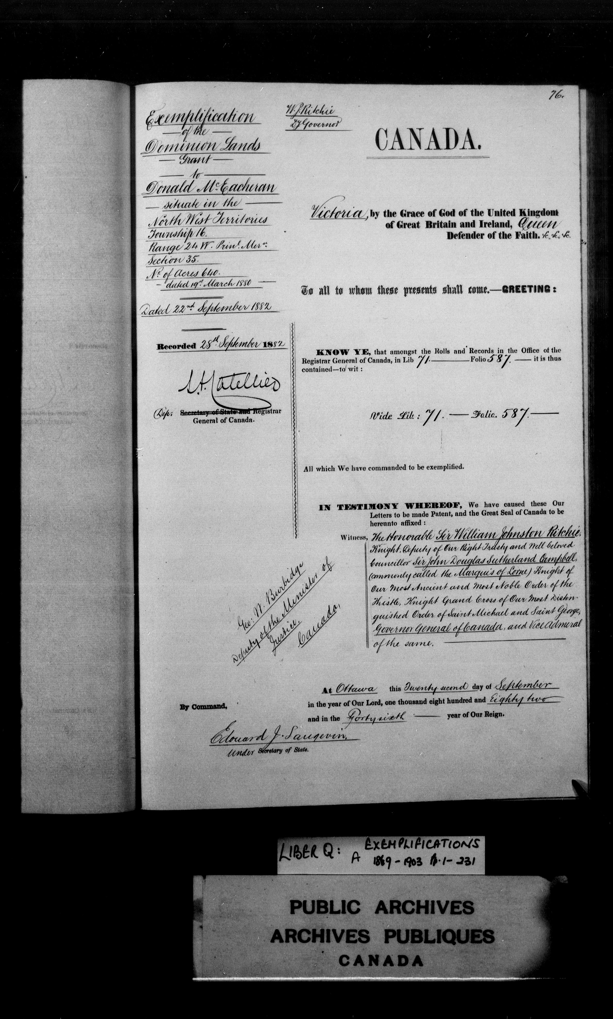 Exemplifications, Upper Canada, Province of Canada and Canada, 1853-1951 : C-3968