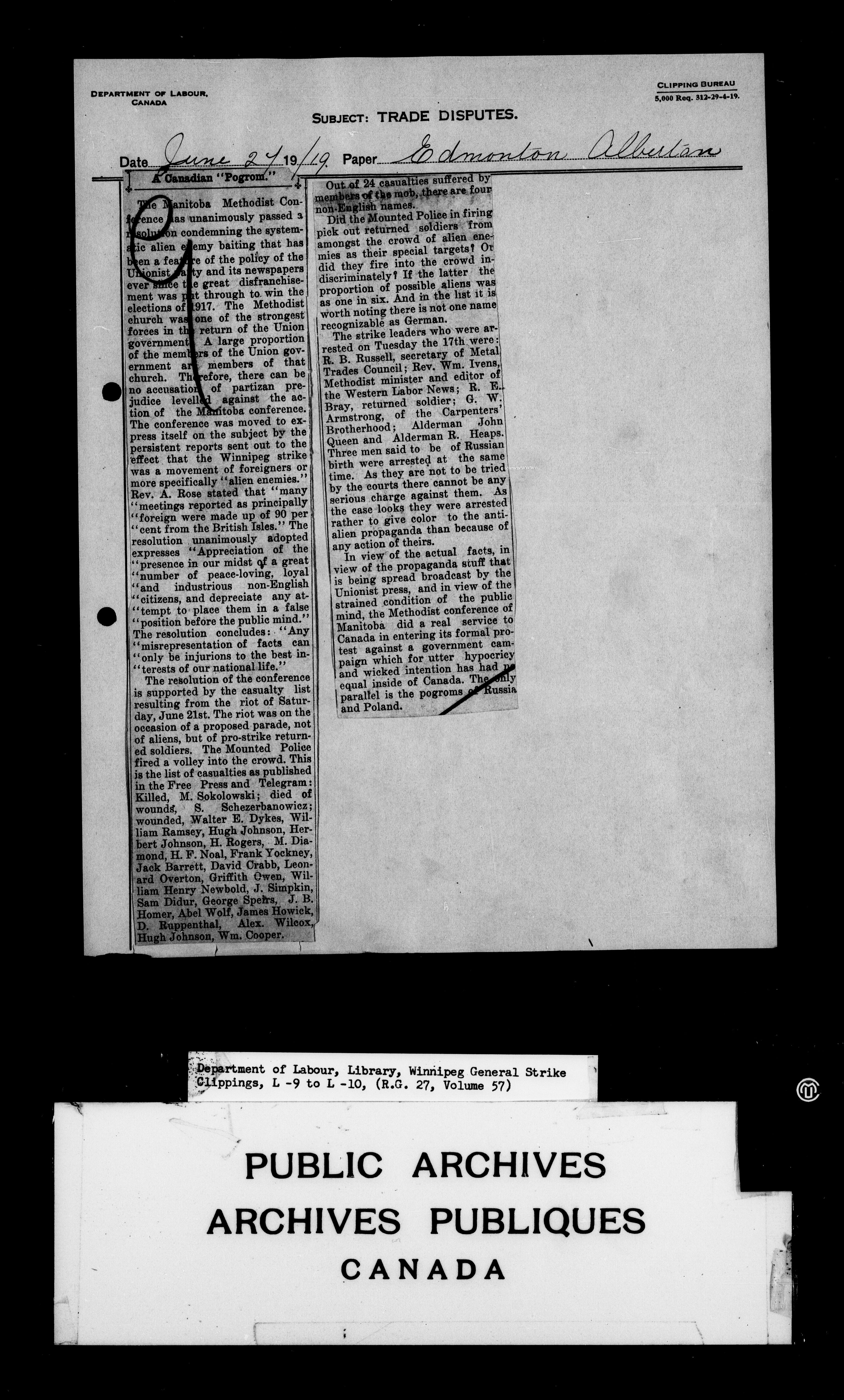 Department of Labour : Winnipeg General Strike Clippings - 4246