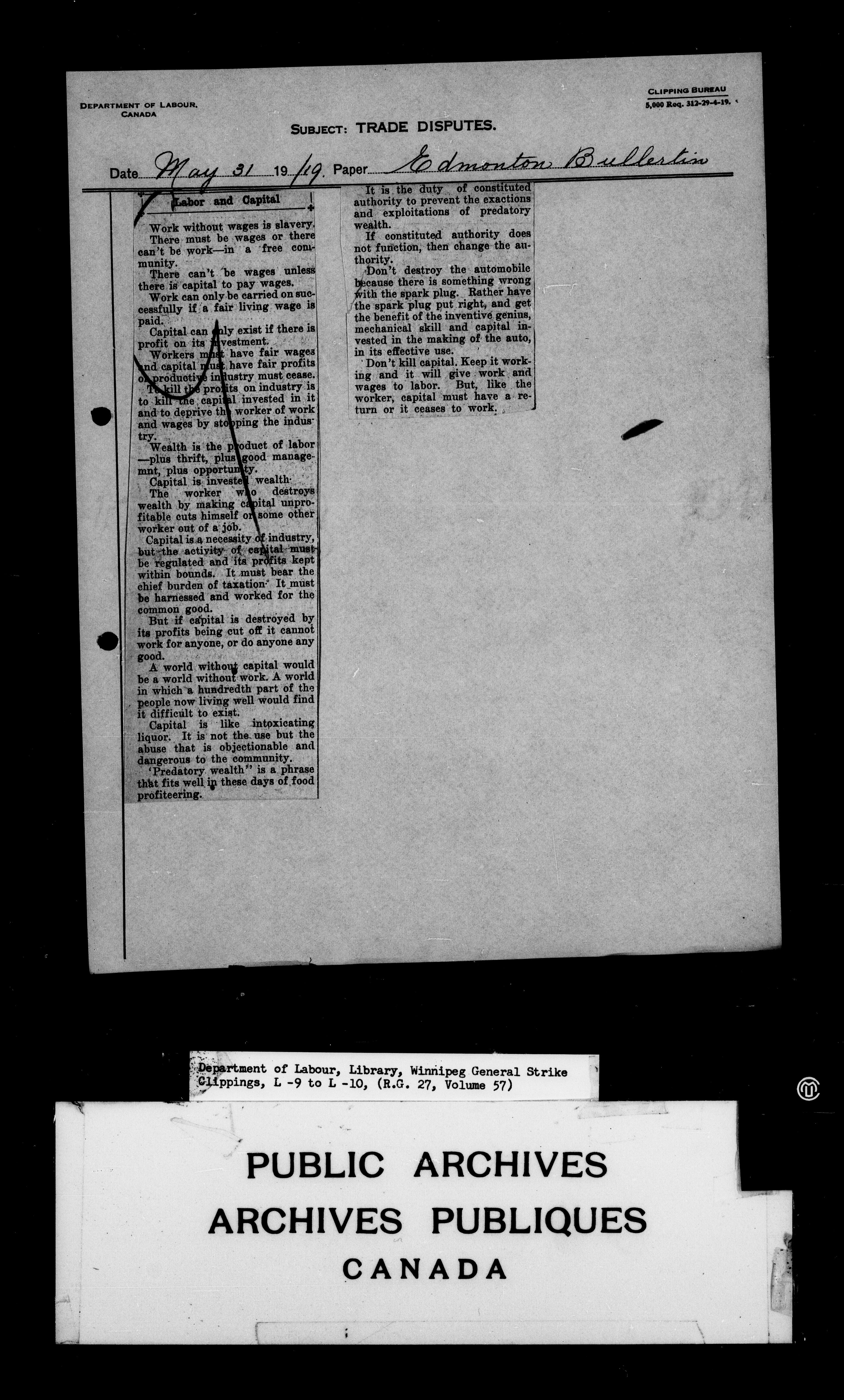 Department of Labour : Winnipeg General Strike Clippings - 4246