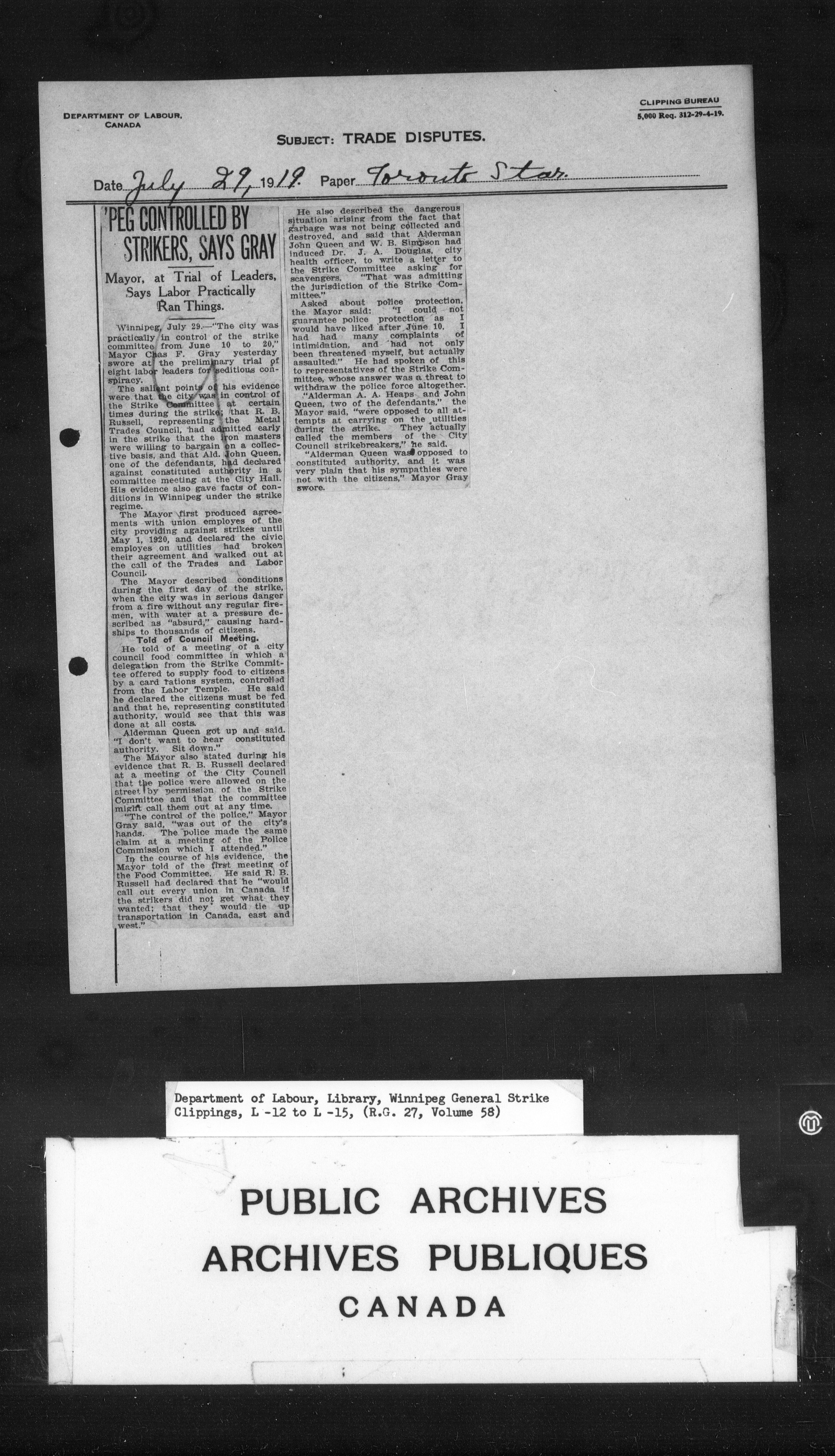 Department of Labour : Winnipeg General Strike Clippings - 4247