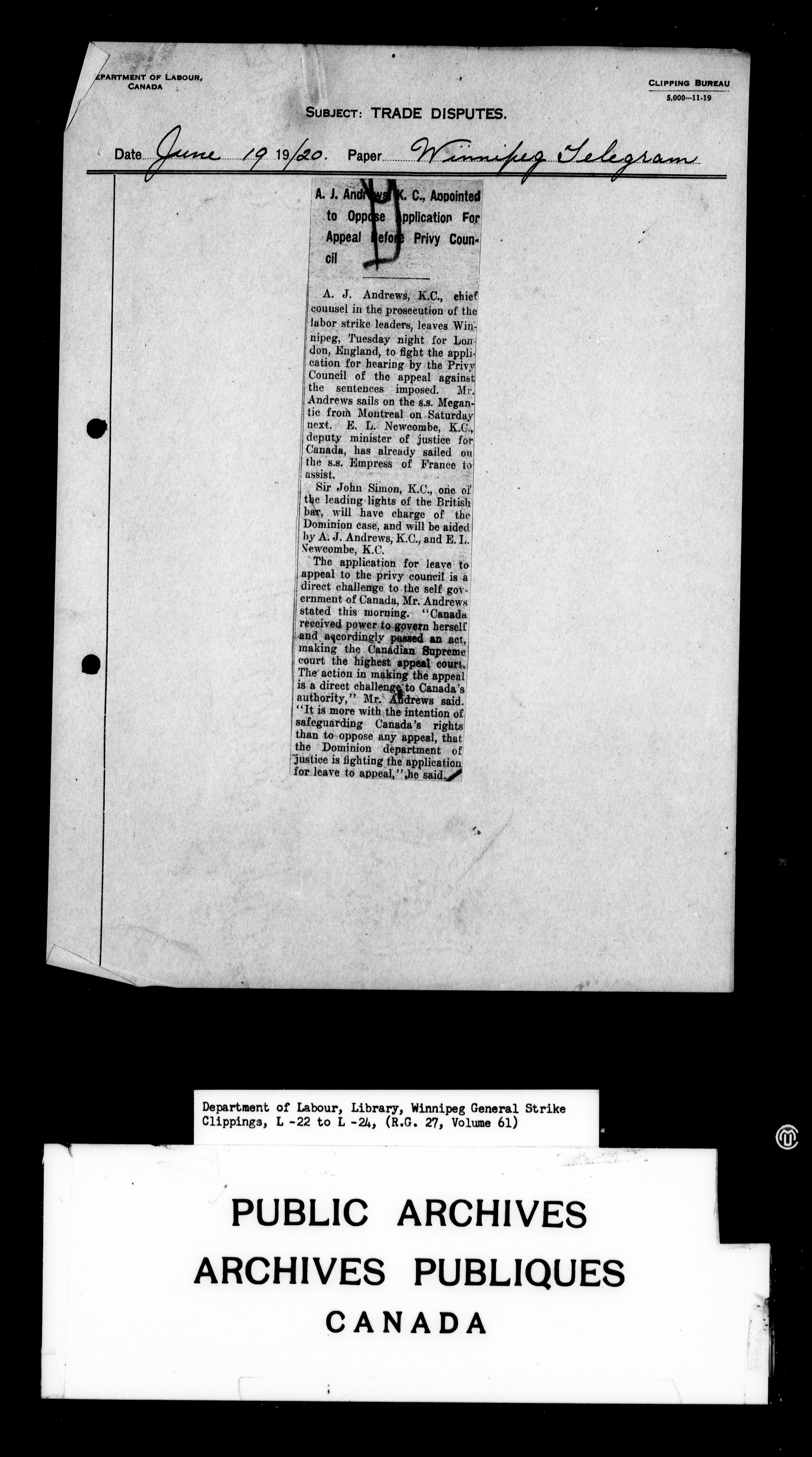 Department of Labour : Winnipeg General Strike Clippings - 4248