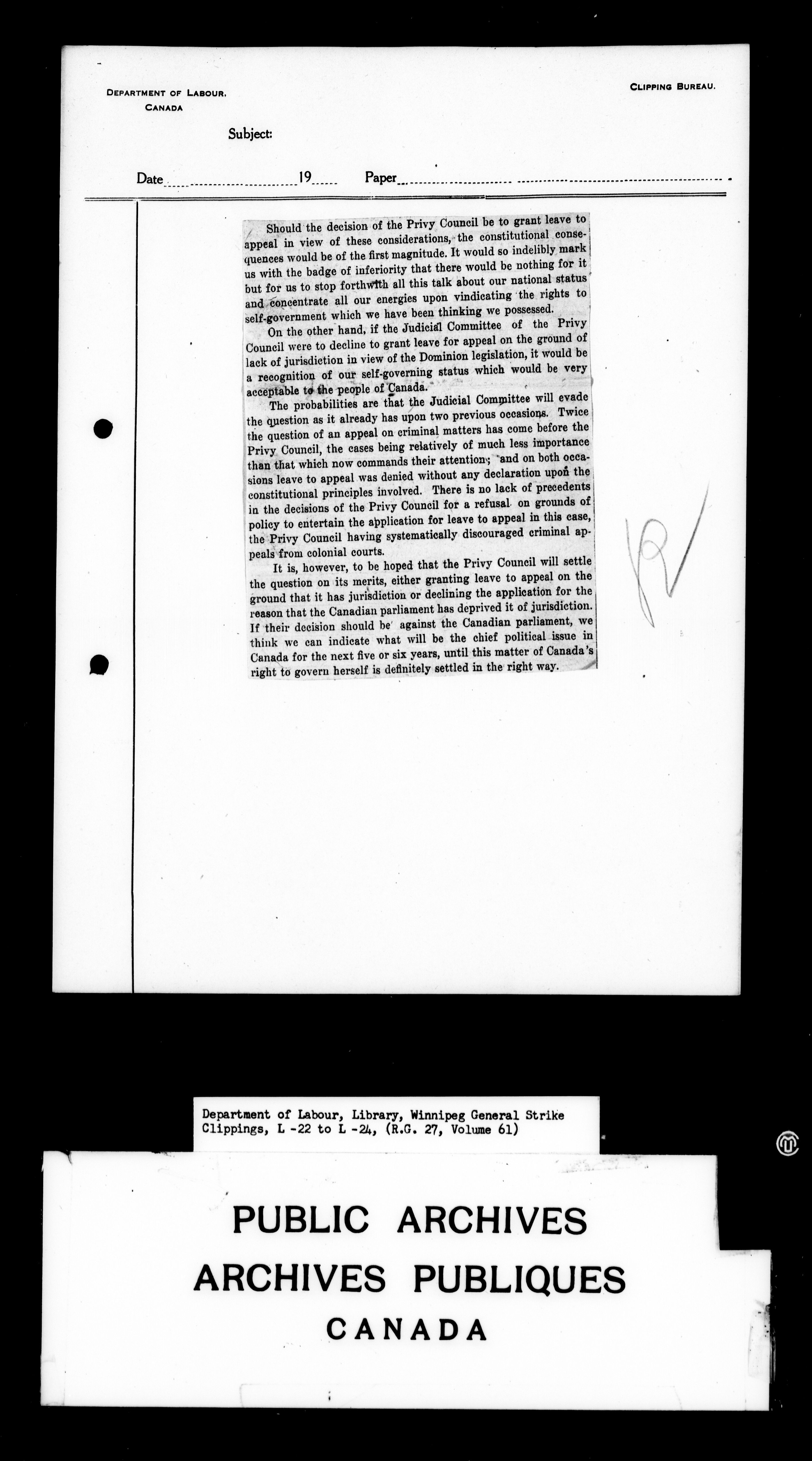 Department of Labour : Winnipeg General Strike Clippings - 4248
