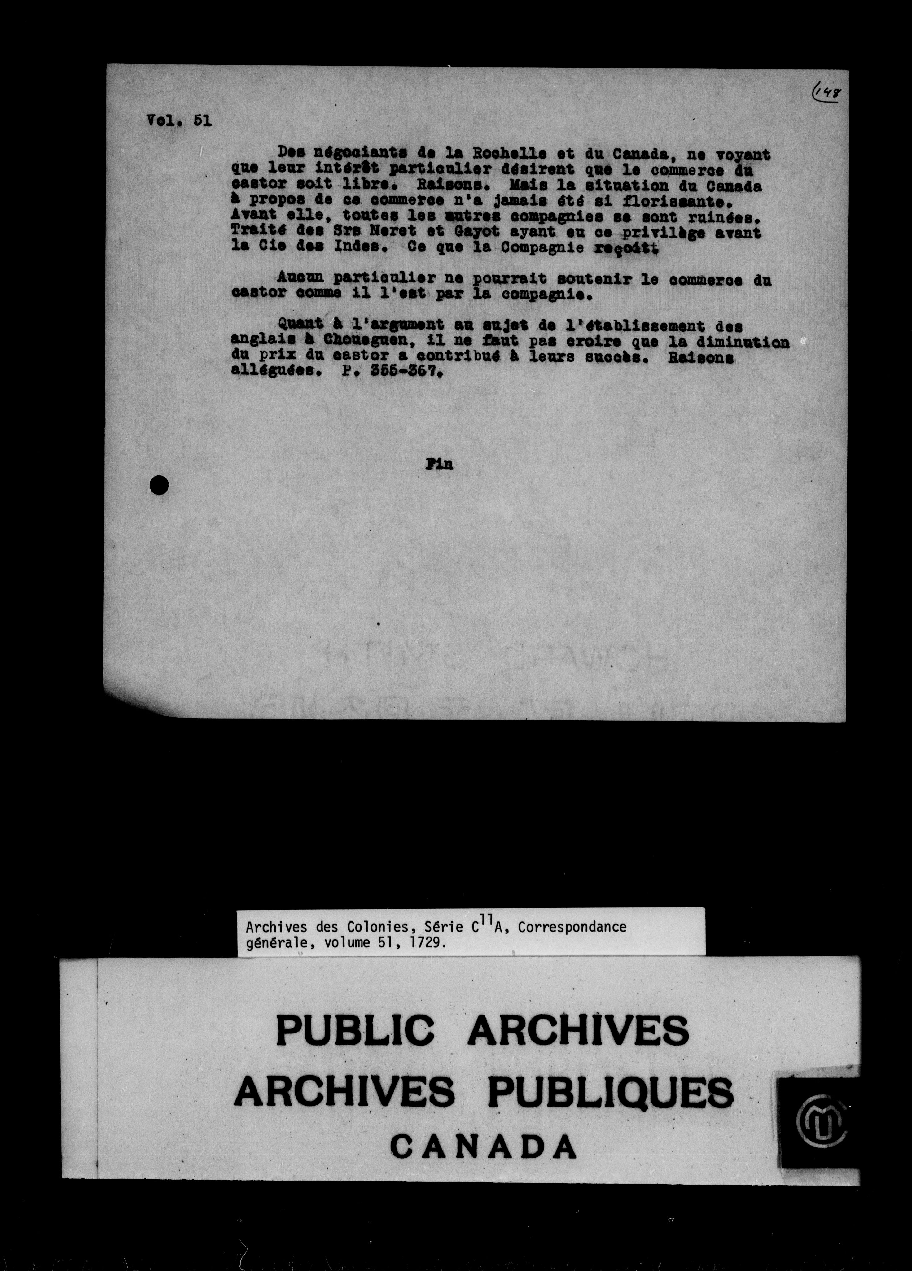 France fonds des Colonies : Série C11A. Correspondance générale; Canada - 4551