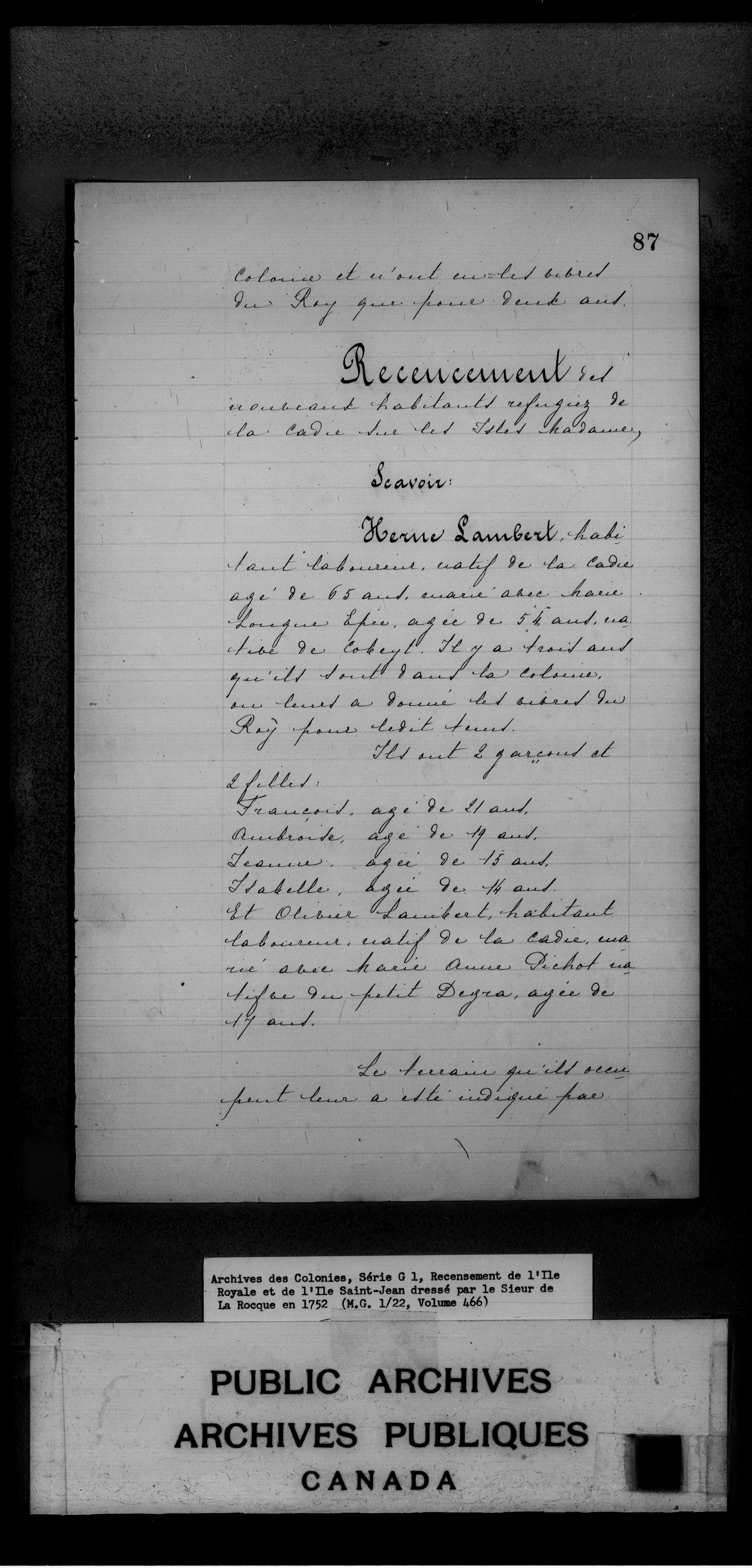 Archives des Colonies : Recensement de l'Île Royal et de l'Île Saint-Jean, Série G1 - 4582