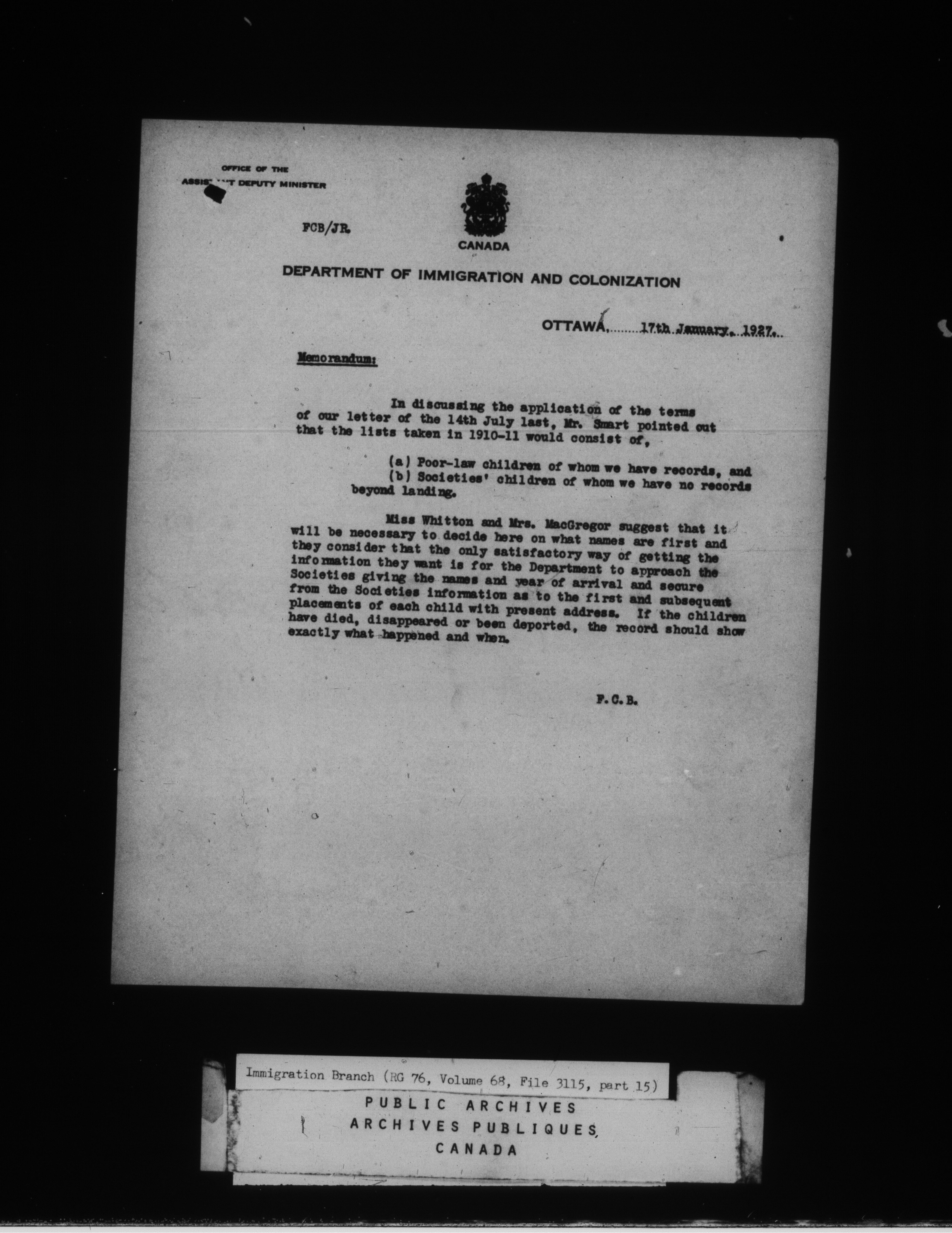 Volume 68, File no. 3115, pt. 15 to Volume 69, File 3115, pt. 20
