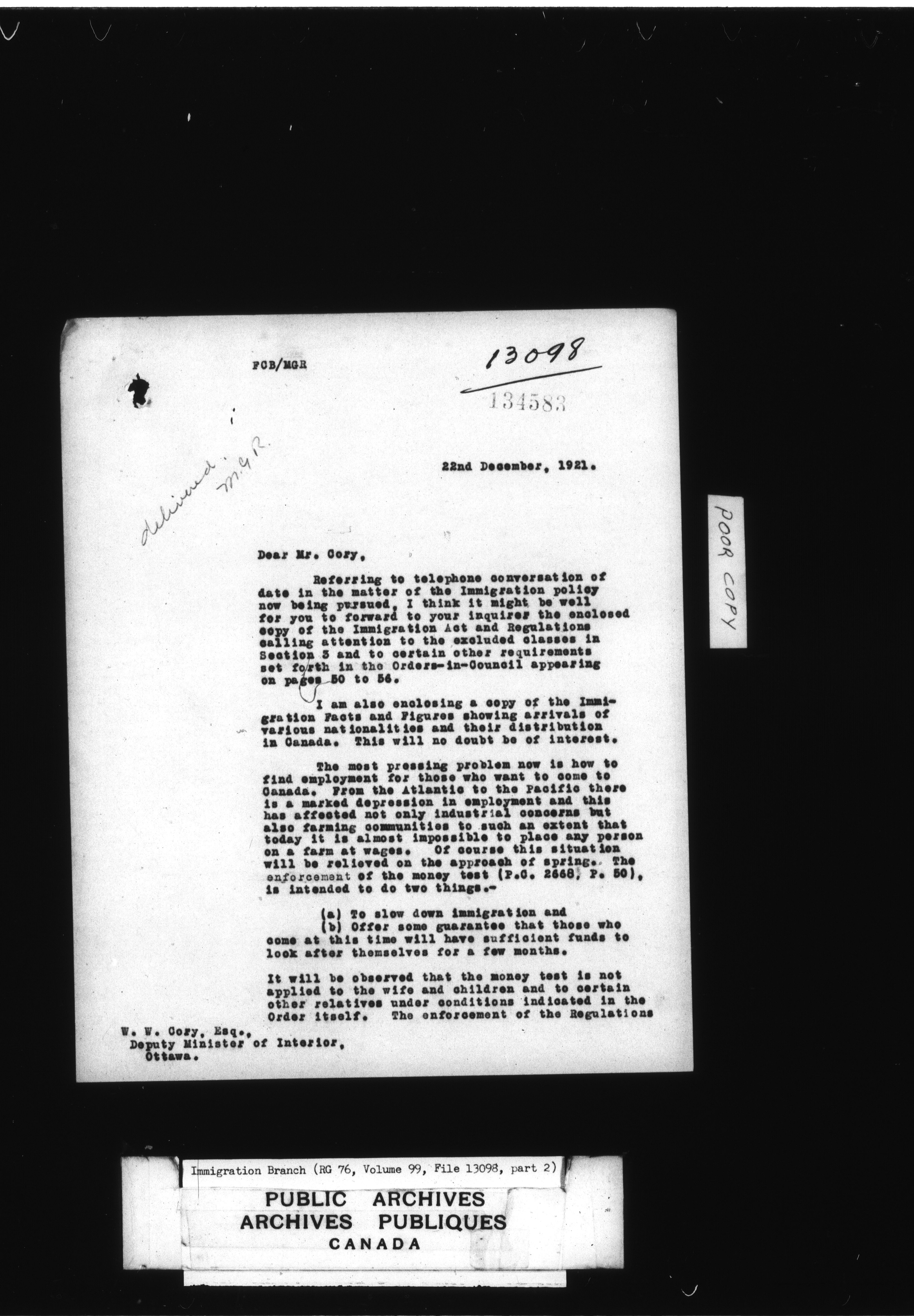 Subject, policy and case files in the First Central Registry series of the Immigration Program, 1892-1950 - 4763