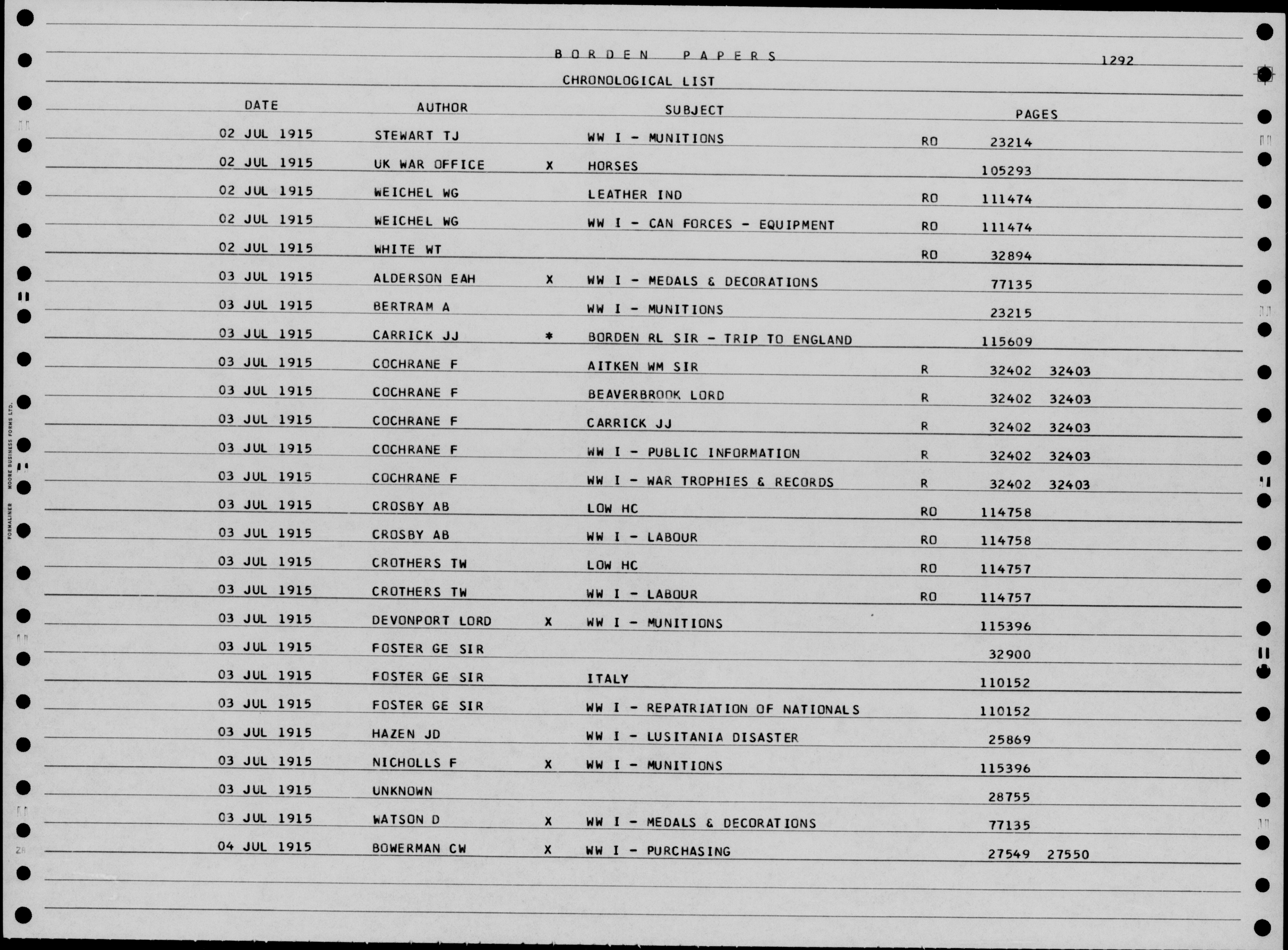 Sir Robert Borden fonds : Subject, author and chronological indexes to volumes 1 to 332 - 4826