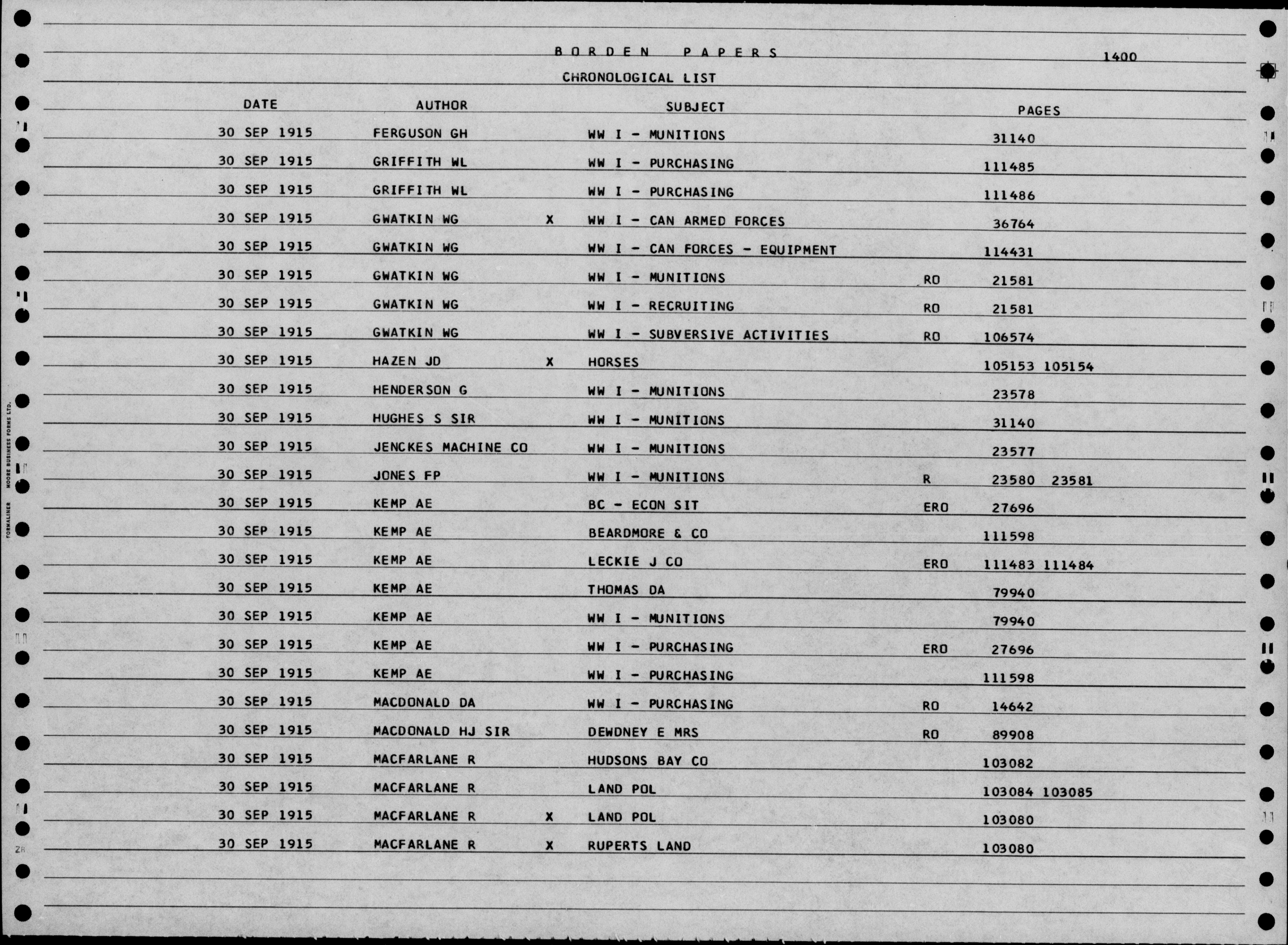 Sir Robert Borden fonds : Subject, author and chronological indexes to volumes 1 to 332 - 4827