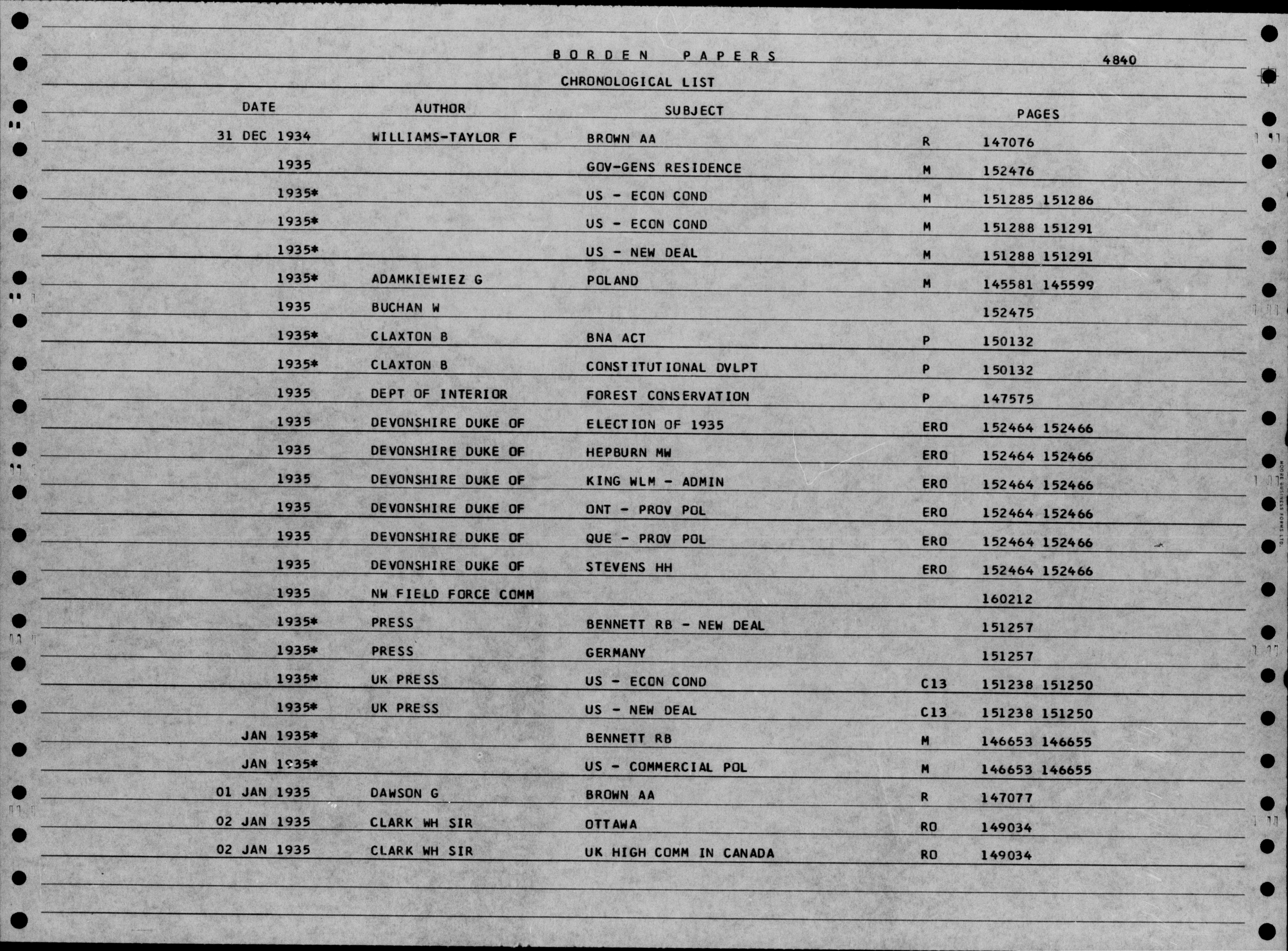 Sir Robert Borden fonds : Subject, author and chronological indexes to volumes 1 to 332 - 4829