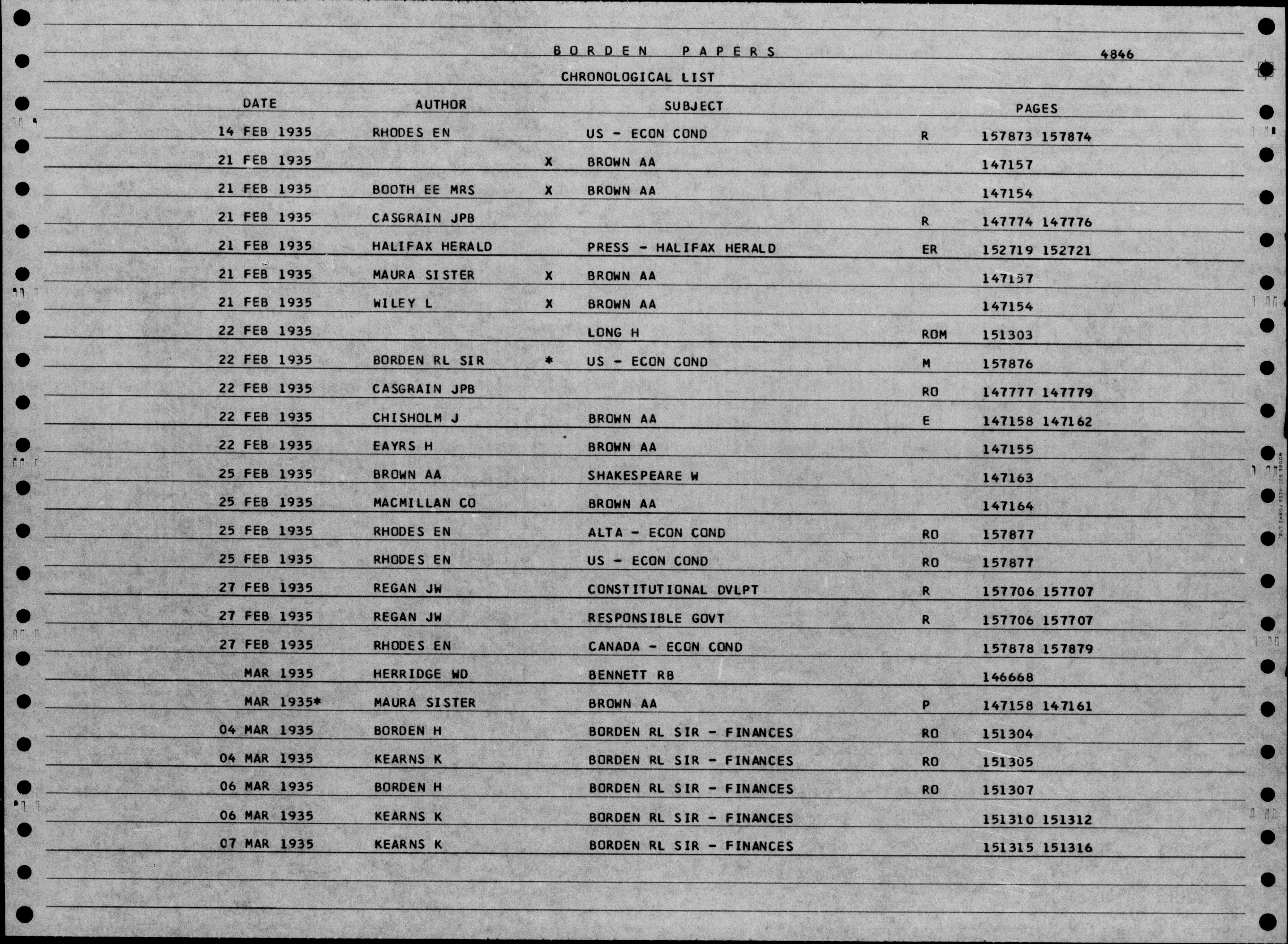 Sir Robert Borden fonds : Subject, author and chronological indexes to volumes 1 to 332 - 4829