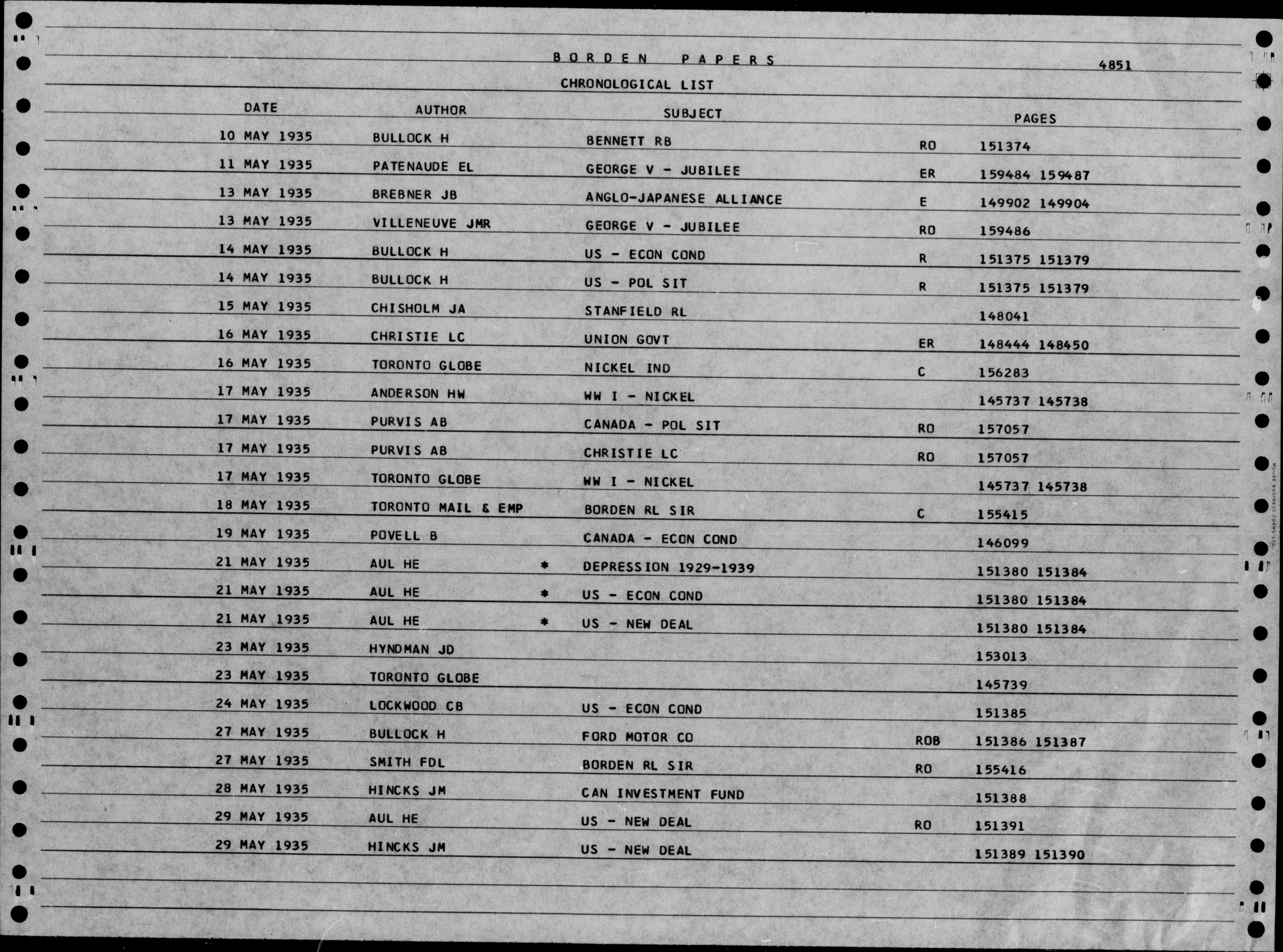 Sir Robert Borden fonds : Subject, author and chronological indexes to volumes 1 to 332 - 4829