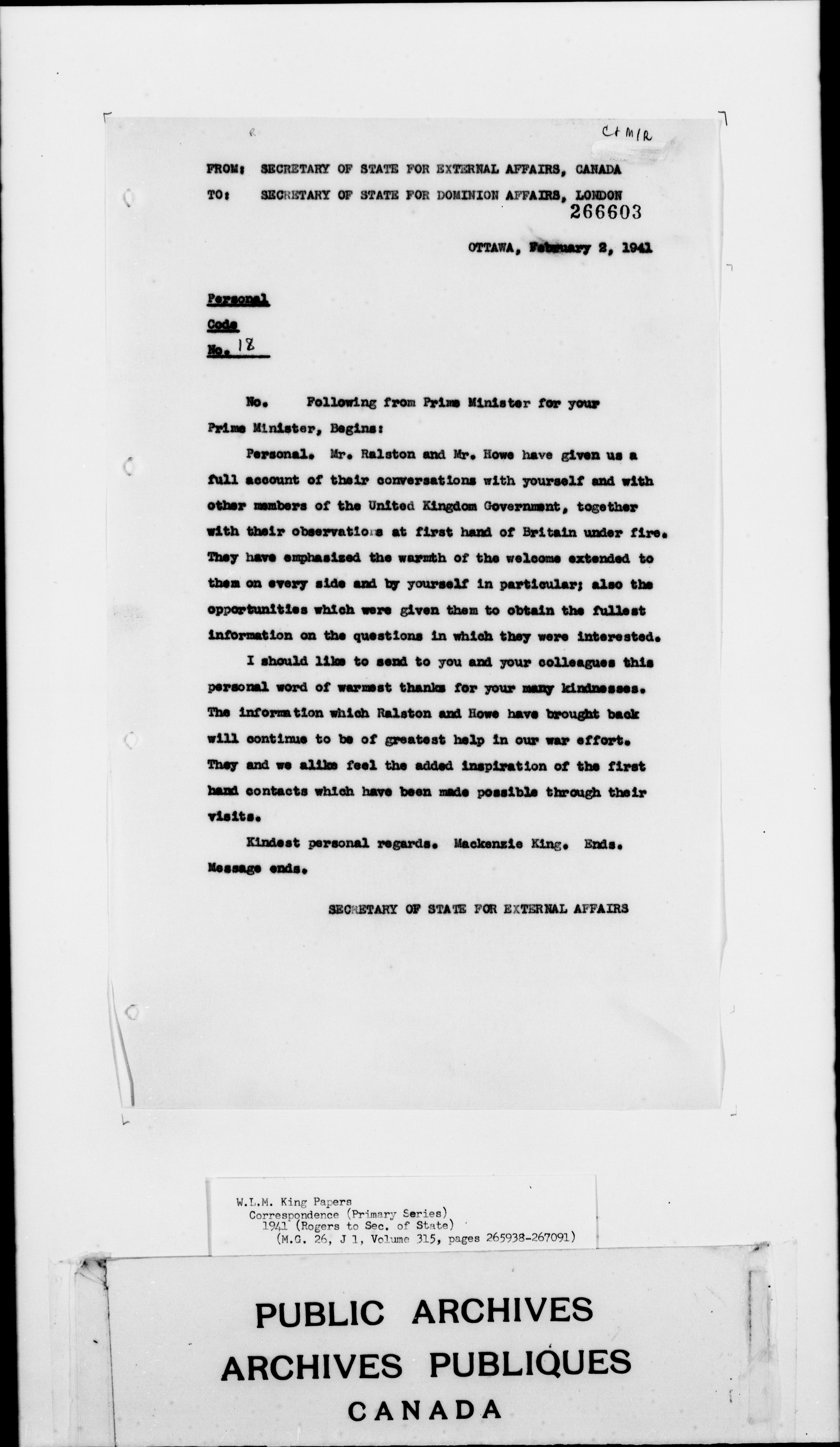 William Lyon Mackenzie King : Primary series correspondence (J1) - 4868