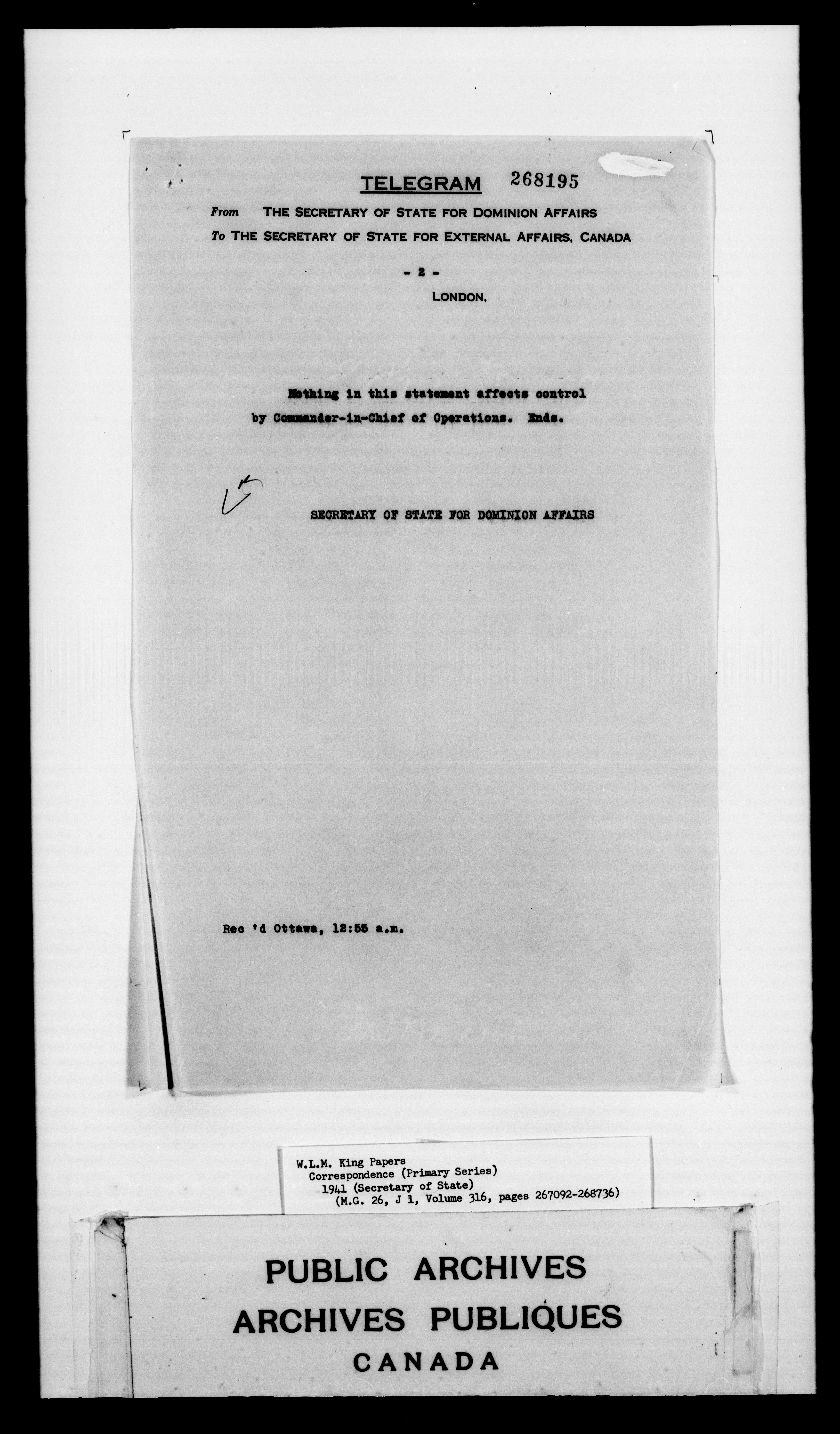 William Lyon Mackenzie King : Primary series correspondence (J1) - 4870