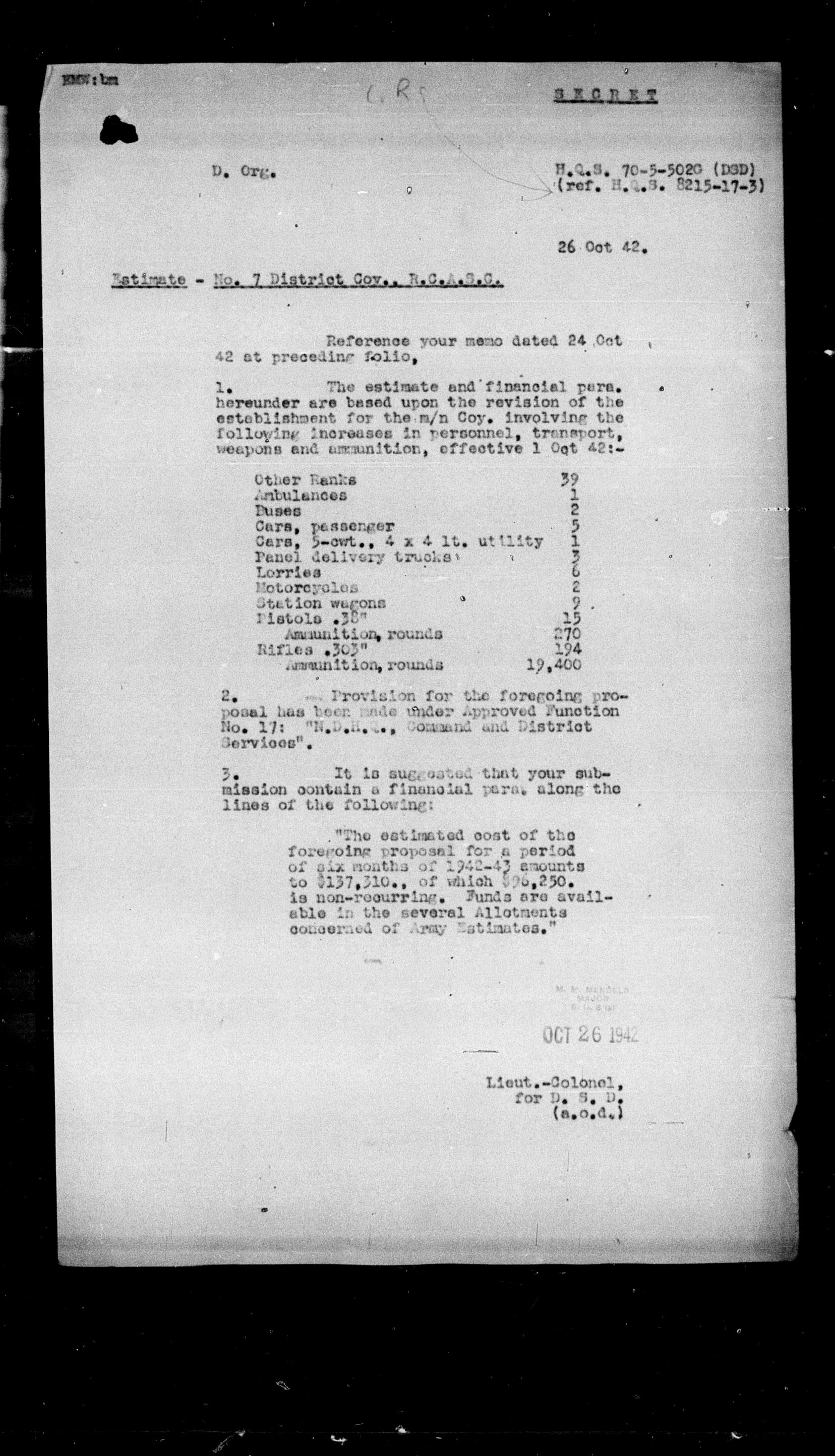 Department of National Defence : 1903 Headquarters Central Registry, subject files, 1866-1950 : C-5030