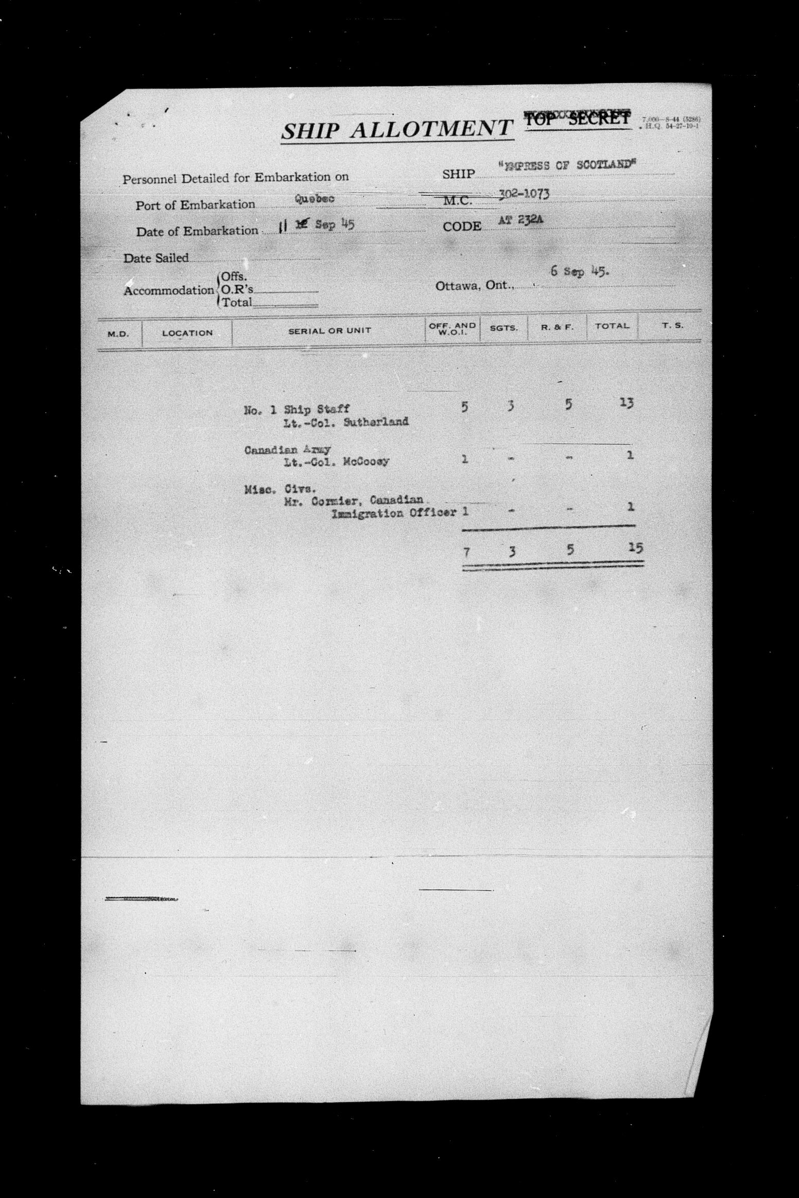 Eastbound Personnel - DUCHESS OF RICHMOND - Port of Departure - Québec - Convoy AT-226c [USA to United Kingdom (Troops)] - HQC 63-302-1065