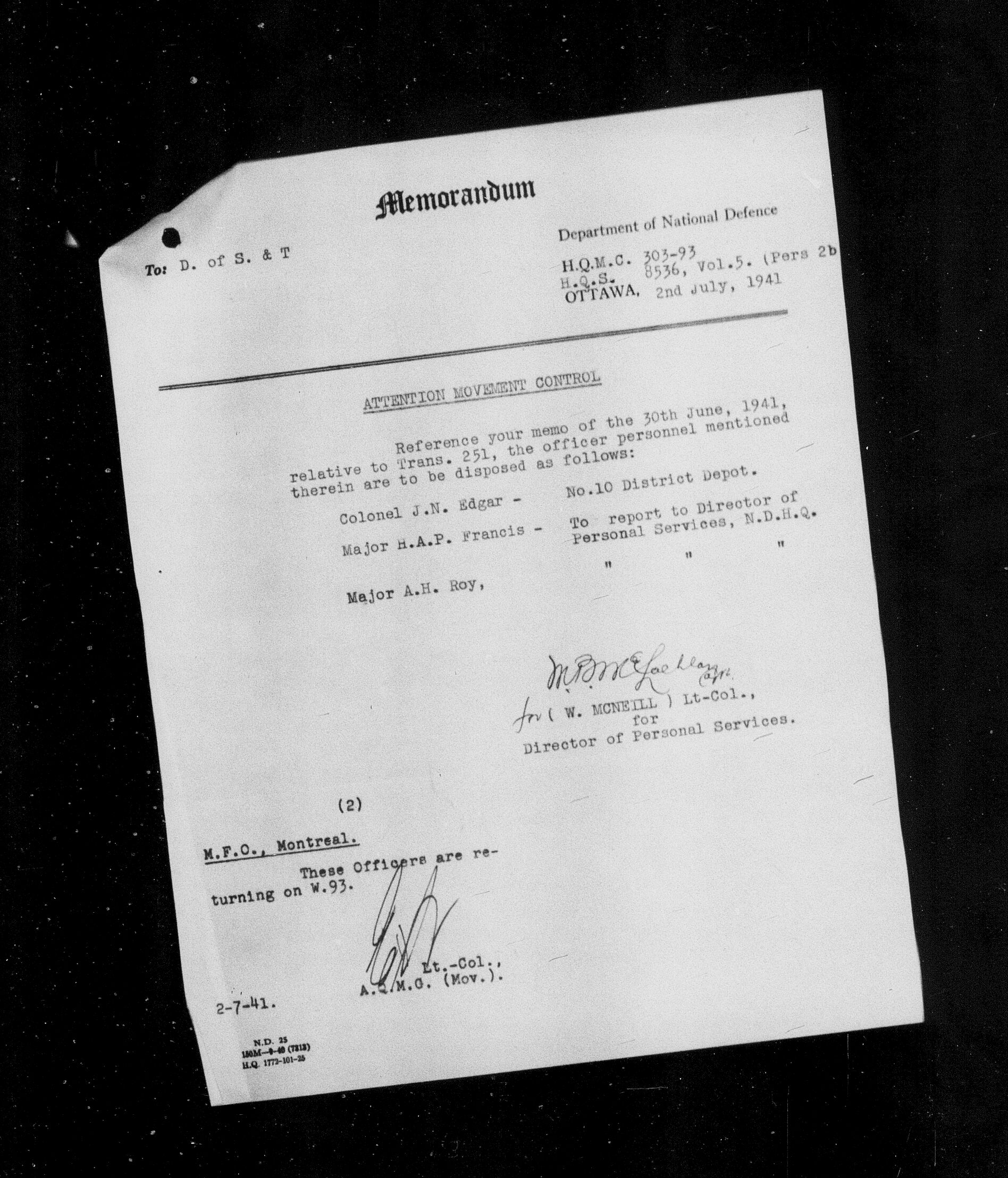 Westbound Personnel - MOSDALE - Port of Departure - Montréal - HQS 63-303-167 - image 02353