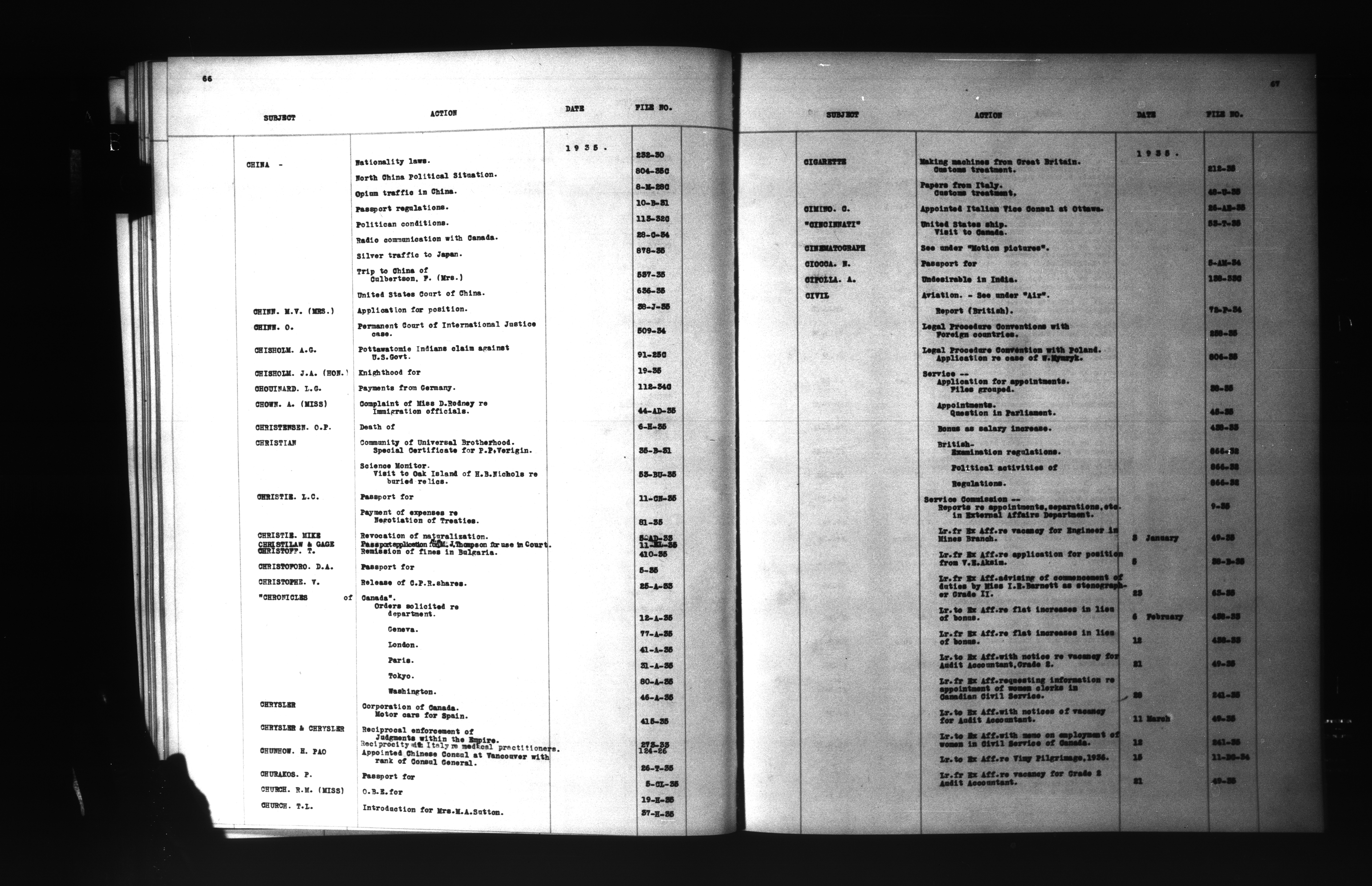 Department of External Affairs: "1939 Series" Central Registry files : Index, 1909-1939 : C-6851
