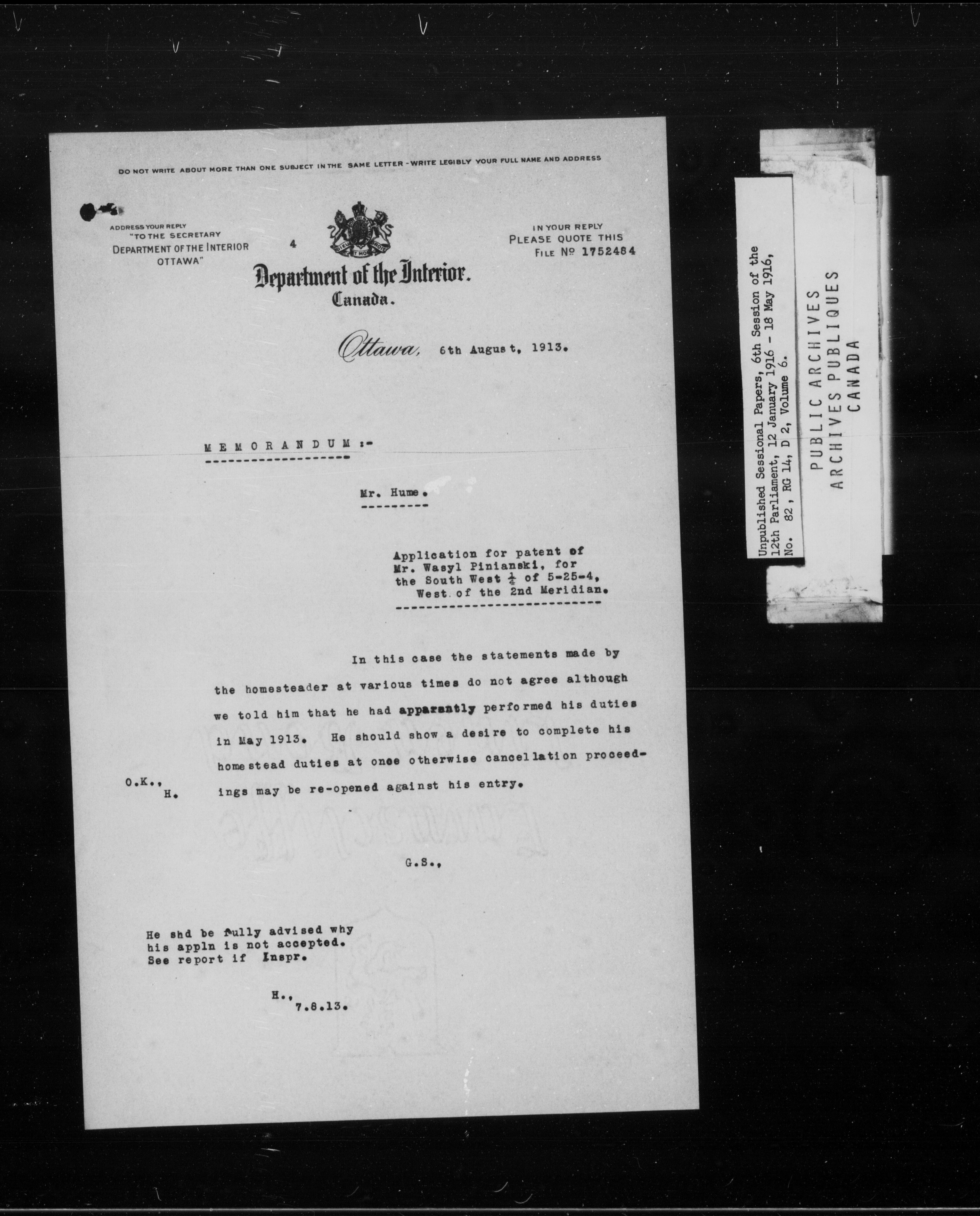 Unpublished Sessional Papers; 6th Session of the 12th Parliament, 12 Jan. 1916-18 May 1916 - 6920